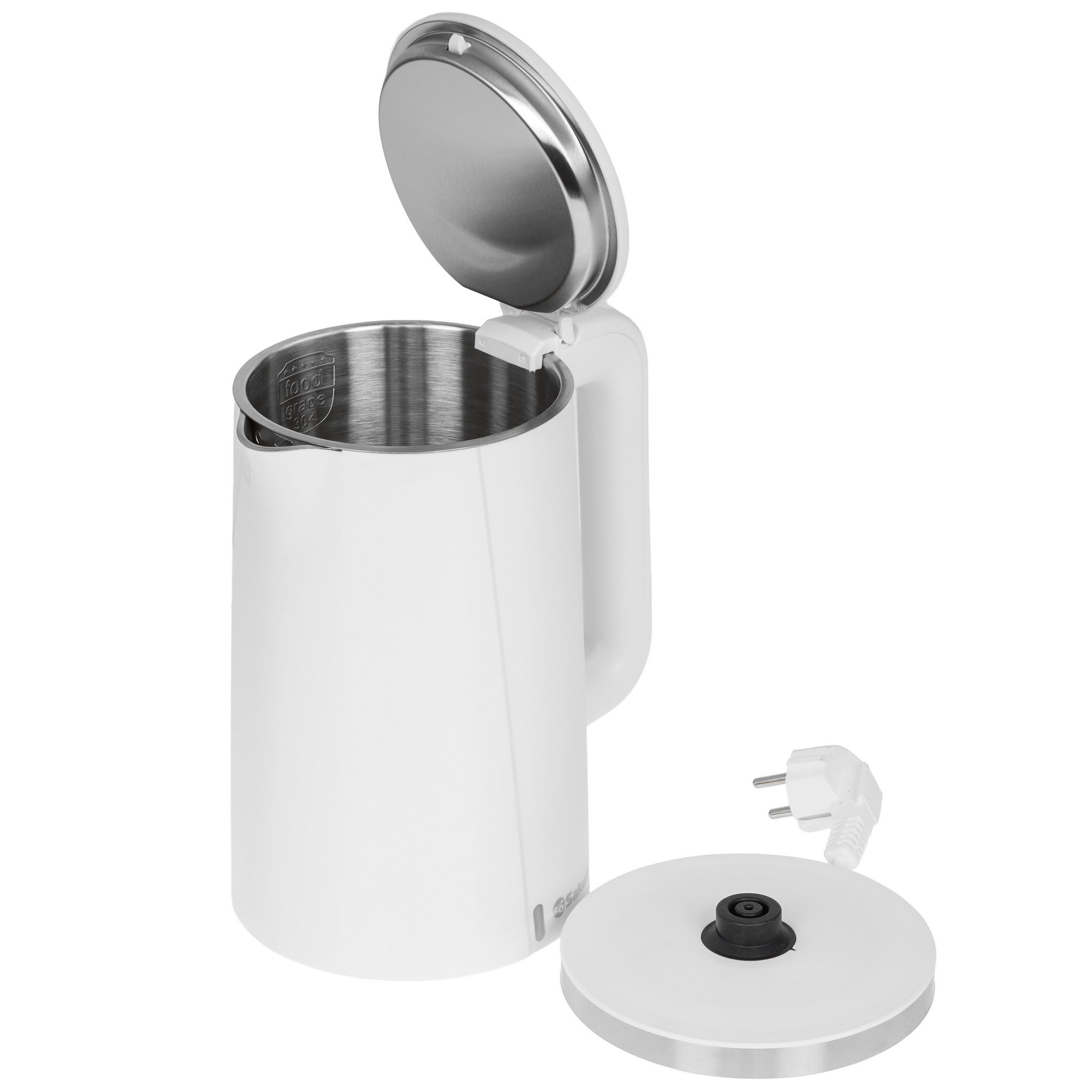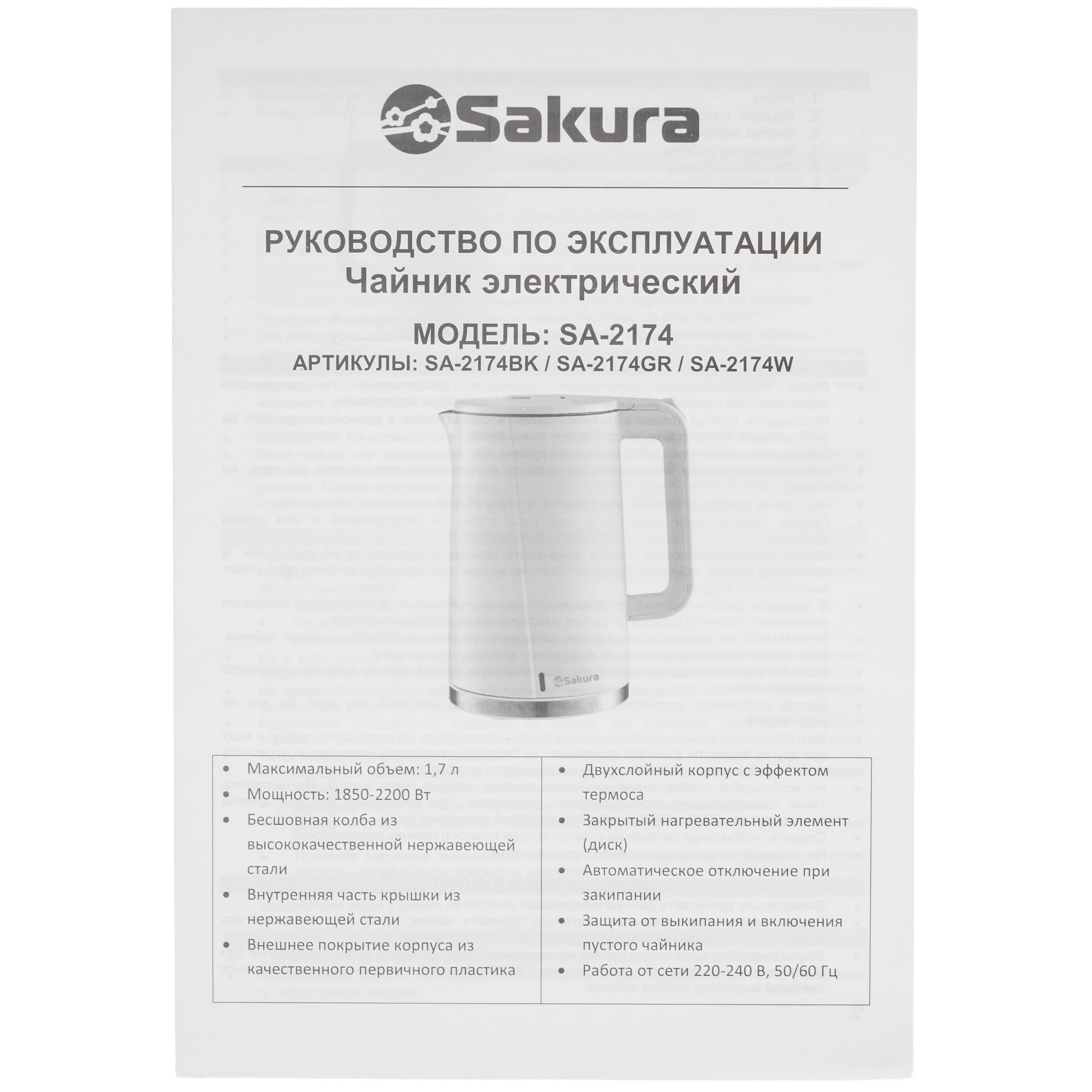 Объем 1.7 л, 1850-2200 Вт, дисковый нагревательный элемент, двухслойный корпус, эффект термоса (быстрее нагревается и дольше удерживает тепло), термоизолированная поверхность, отключение при закипании/без воды, световой индикатор работы, внутренний индикатор уровня воды, вращение на 360°.
