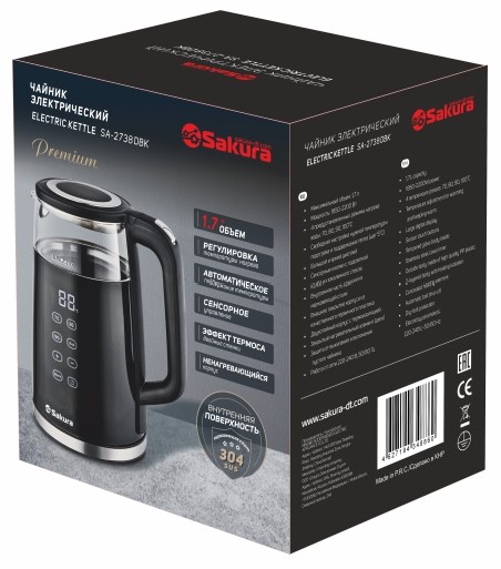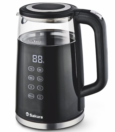 Объем 1,7 л, 1850-2200 Вт, 4 темп. режима (70, 80,90, 100⁰С) + свободный режим нагрева (шаг 5⁰С), 2-слойный корпус (стеклянная колба и пластик сверху), большой LED дисплей, сенсорное управление с подсветкой, звуковой сигнал, поддержание температуры в течение 2 часов, диск.нагревтель, вращение на 360°, защита от выкипания. Длина шнура 0,64 м.