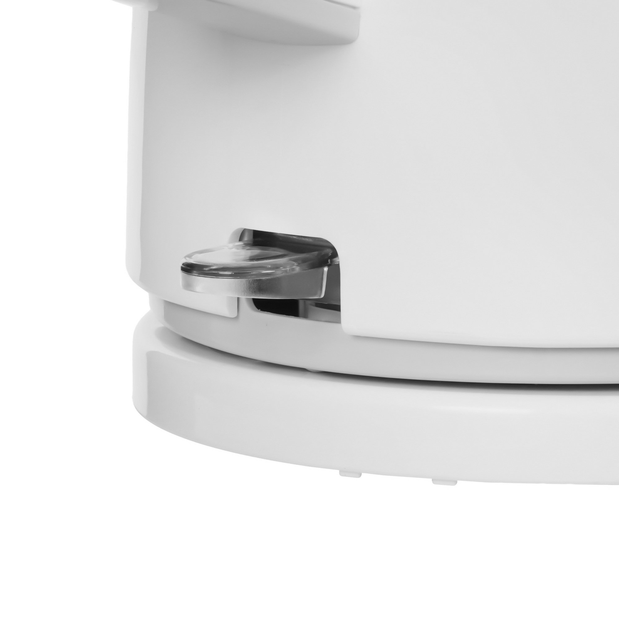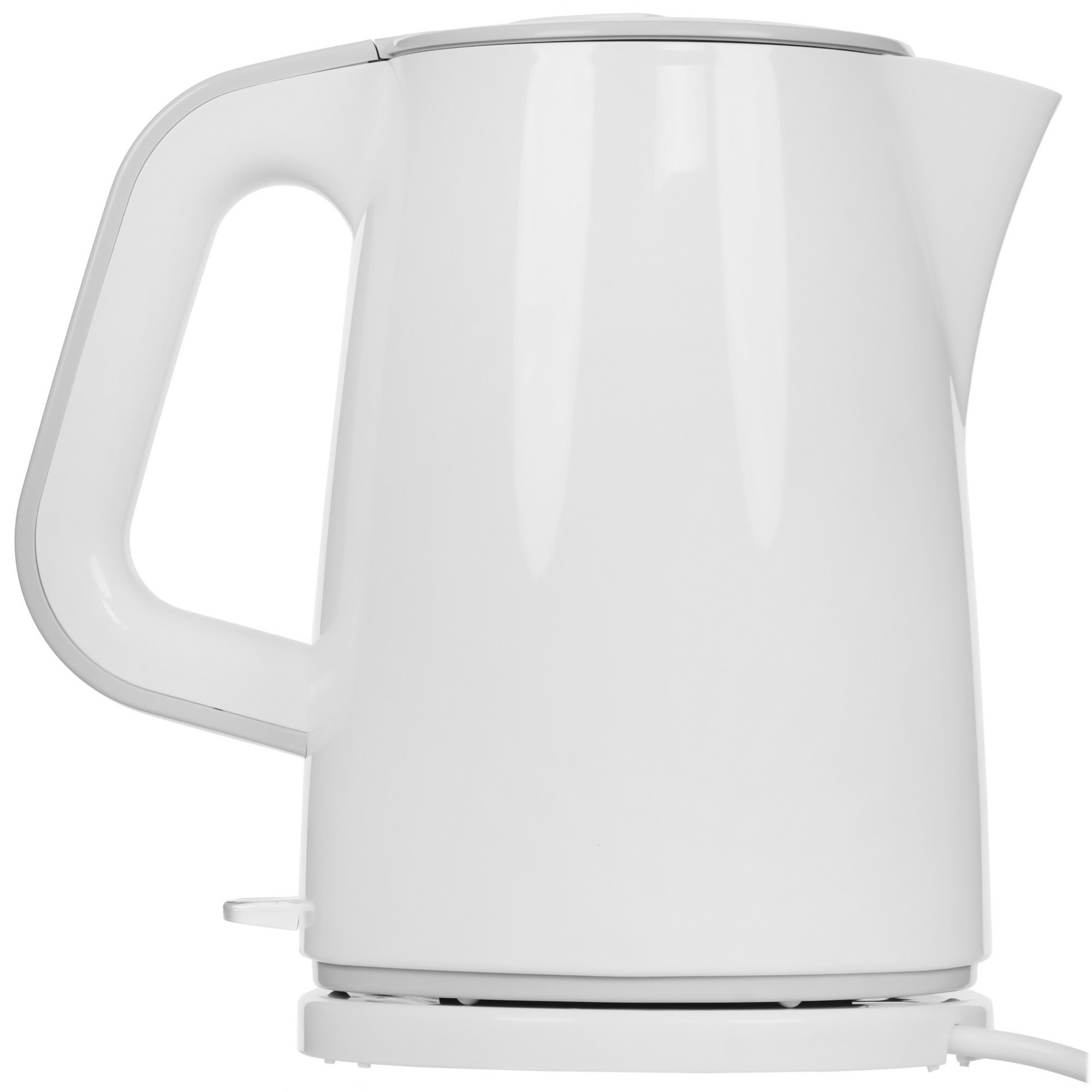 Корпус чайника изготовлен из высококачественного пластика в белом цвете с серыми вставками. Кроме того, он имеет несколько систем безопасности, включая автоматическое отключение после закипания воды, автоматическое отключение при снятии с подставки и защиту от включения без воды.