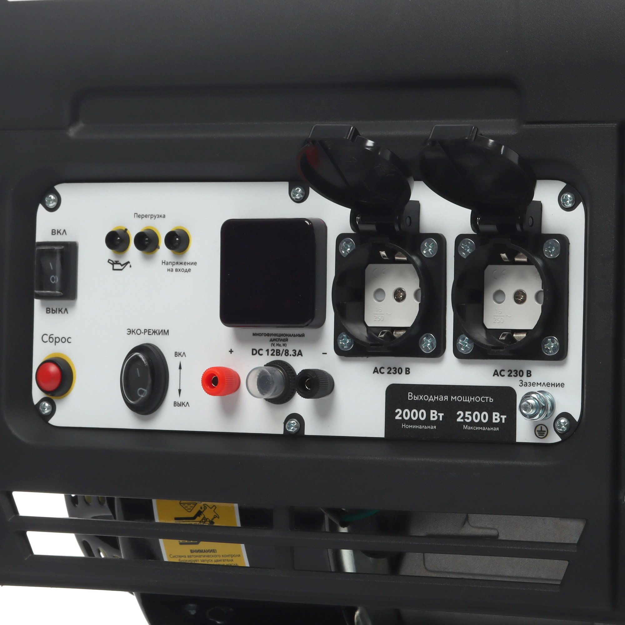 Многофункциональный дисплей информативно отображает часы работы, напряжение, частоту тока и предупреждает о низком уровне масла. Многоступенчатая система защиты от повреждений гарантирует безопасность работы. Обмотка альтернатора из 100% меди эффективно проводит ток и минимизирует нагрев при значительных нагрузках. Низкий уровень шума (96 дБ) достигается благодаря равномерной нагрузке двигателя.