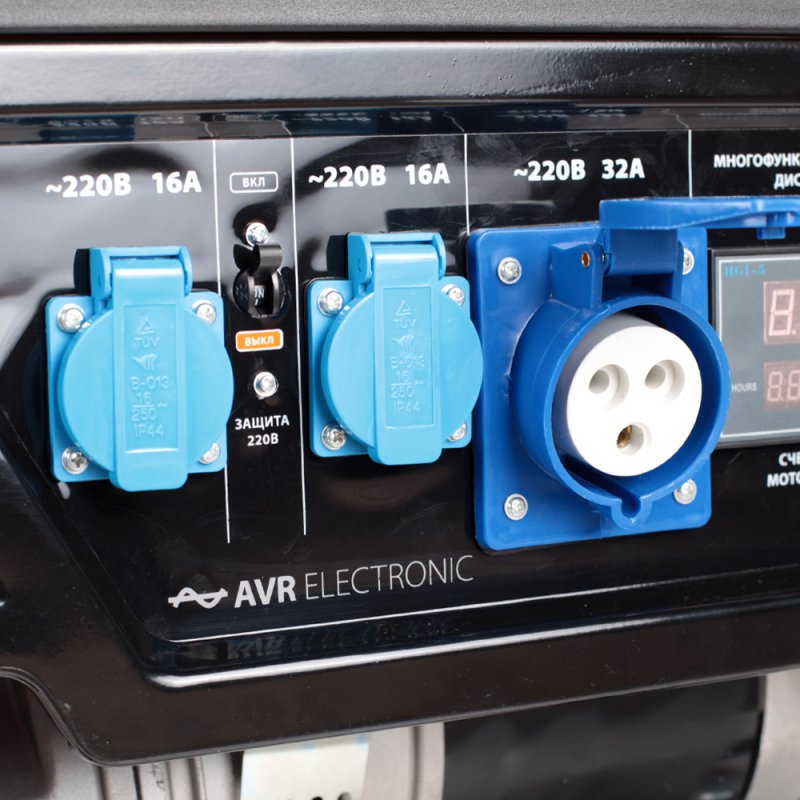 Генератор применяется в качестве аварийного или автономного источника электроэнергии для питания мощных бытовых электроприборов, электроинструмента, небольших станков, сварочных аппаратов. Оптимальное соотношение мощности двигателя и электрогенератора обеспечивает стабильную работу на номинальной мощности. Оснащен двигателем с верхним расположением клапанов [OHV], что значительно увеличивает ресурс, снижает выхлоп и уровень шума. Датчик контроля масла исключает запуск и работу генератора при отсутствии или низком уровне масла в картере. Синхронный электрогенератор с системой автоматической регулировки и медными обмотками обеспечивает стабильное выходное напряжение и частоту тока. Установлена мощная силовая розетка 32А для снятия всей мощности генератора с одного выхода (силовая вилка 32А в комплекте). Цифровой электронный мультидисплей позволяет контролировать все выходные характеристики: напряжение, мощность, ток, частоту, а также счетчик моточасов помогает следить за интервалами между техническим обслуживанием. Выход 12 вольт позволяет подзарядить автомобильный аккумулятор в экстренном случае. Усиленная передняя панель с утопленными элементами управления снижает риск механических повреждений. Адаптирован под установку транспортировочного комплекта.