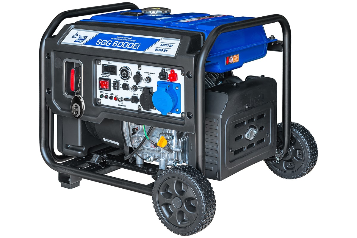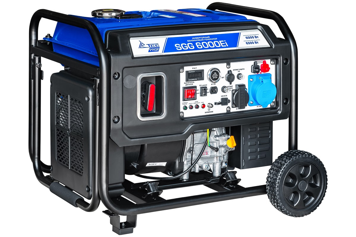 Бензогенератор инверторный SGG 6000Ei с электростартом, коннектором для подключения блока АВР(блок автоматического запуска генератора), укомплектован колесным комплектом для удобства перемещения. Бензиновый генератор предназначен для подключения к нему потребителей тока общей максимальной мощностью до 6,5 кВт. Позволяет напрямую подключать к генератору как обычных потребителей, так и точное электронное оборудование, например, ноутбуки, LCD-телевизоры или смартфон. Благодаря использованию в этой модели инверторного преобразователя, на выходе получается стабильный ток, без каких-либо скачков, генератор способен регулировать работу двигателя в зависимости от нагрузки: к примеру, если нагрузка составляет половину от выходной мощности, то и мощность двигателя снижается вдвое; это дает значительную экономию топлива.
