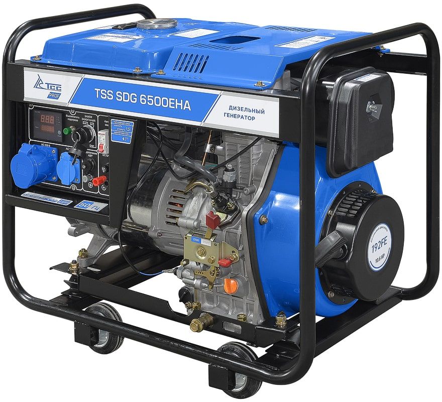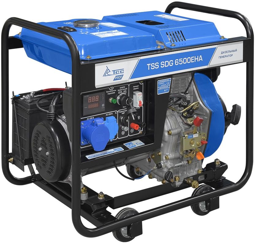 Дизель генератор с электростартом и с разъемом для подключения блока автоматики. TSS SDG 6500EHА предназначен для выработки электроэнергии с основными характеристиками: напряжение - 220 вольт, частота 50 Гц и номинальной мощностью 6 кВт, оснащенный колесным комплектом для удобства передвижения.