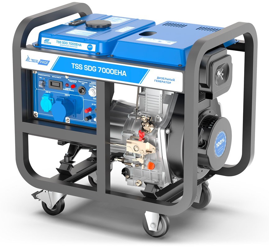 Дизель генератор с электростартером и с разъемом для подключения блока автоматики. TSS SDG 7000EHА предназначен для выработки электроэнергии с основными характеристиками: напряжение - 220 вольт, частота 50 Гц и номинальной мощностью 6,5 кВт, оснащенный колесным комплектом для удобства передвижения.