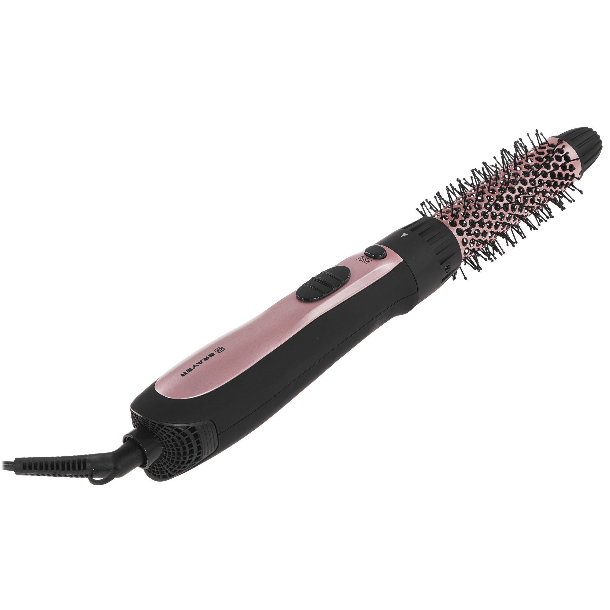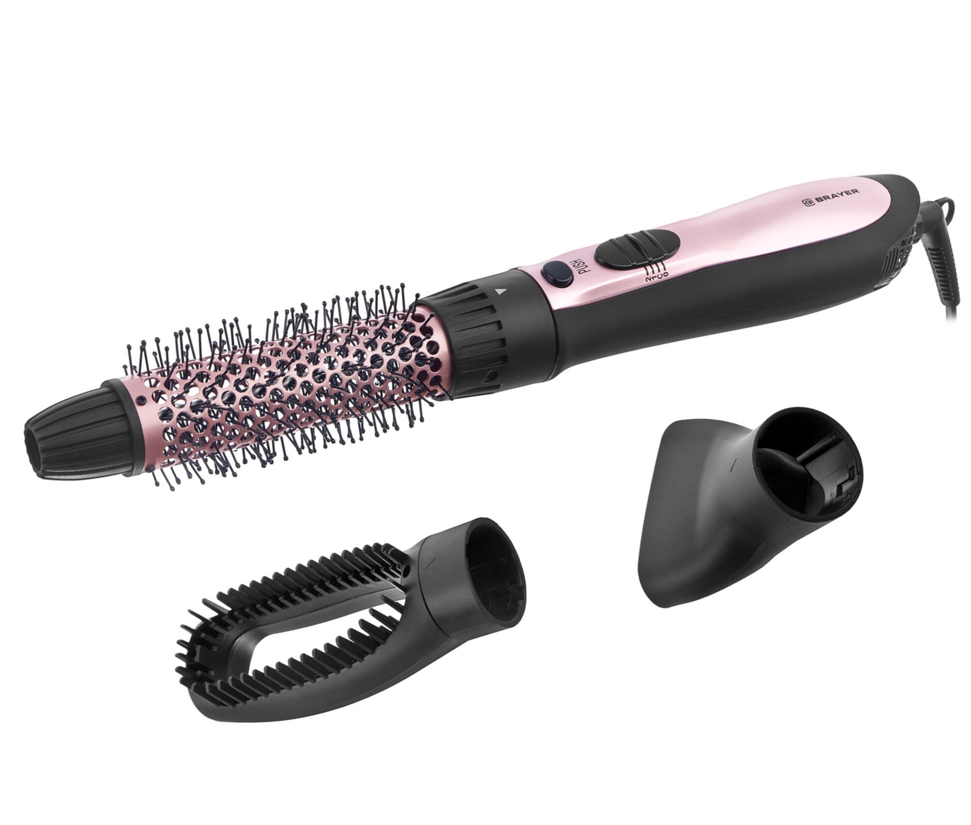 Фен-щетка BRAYER 3130BR-GD мощностью 800 Вт комплектуется 3 насадками, которые служат для создания объема и разглаживания прядей. Вращение 1.8-метрового сетевого шнура предупреждает риск спутывания и образования заломов. Компактному размещению прибора на держателе в ванной комнате способствует петля для подвешивания.