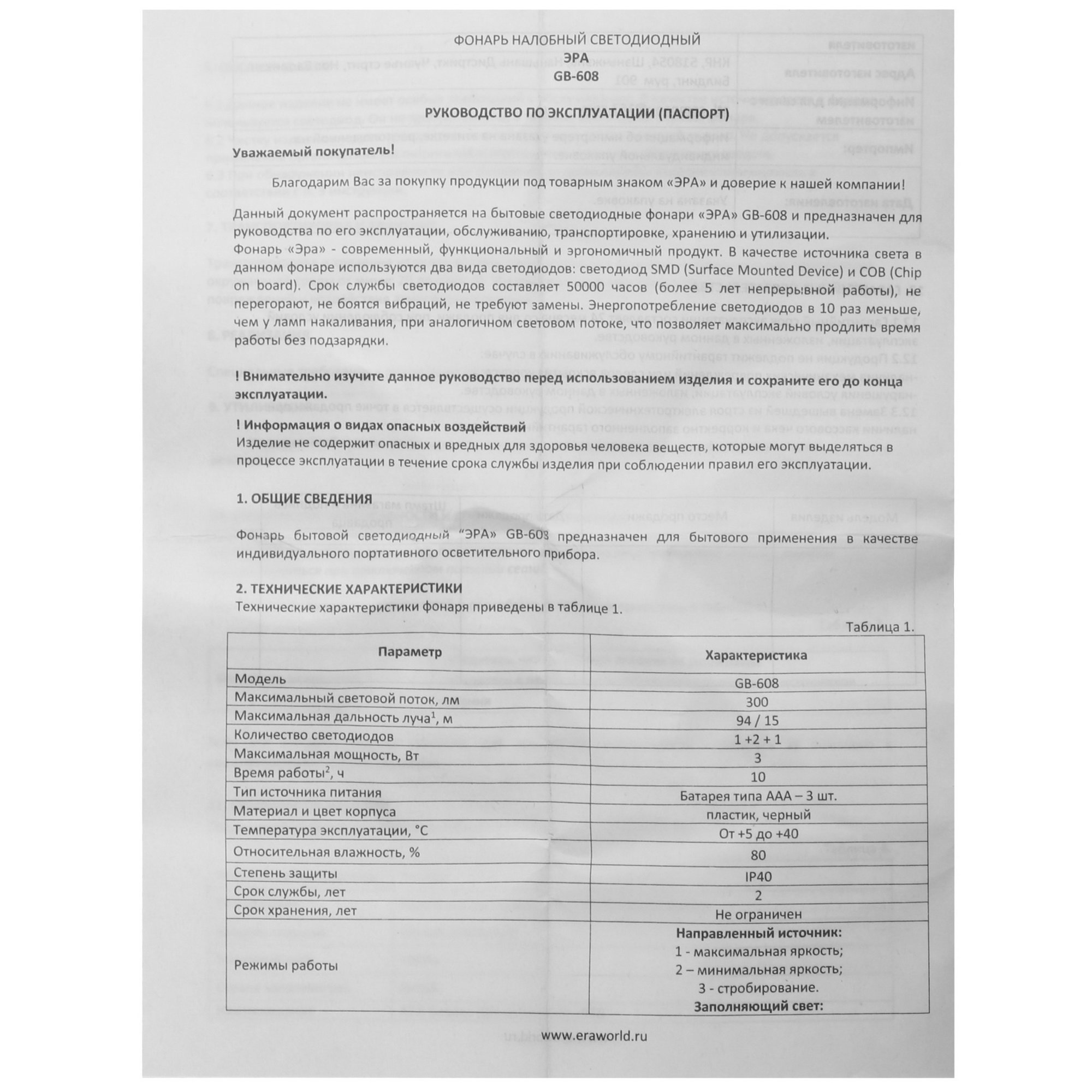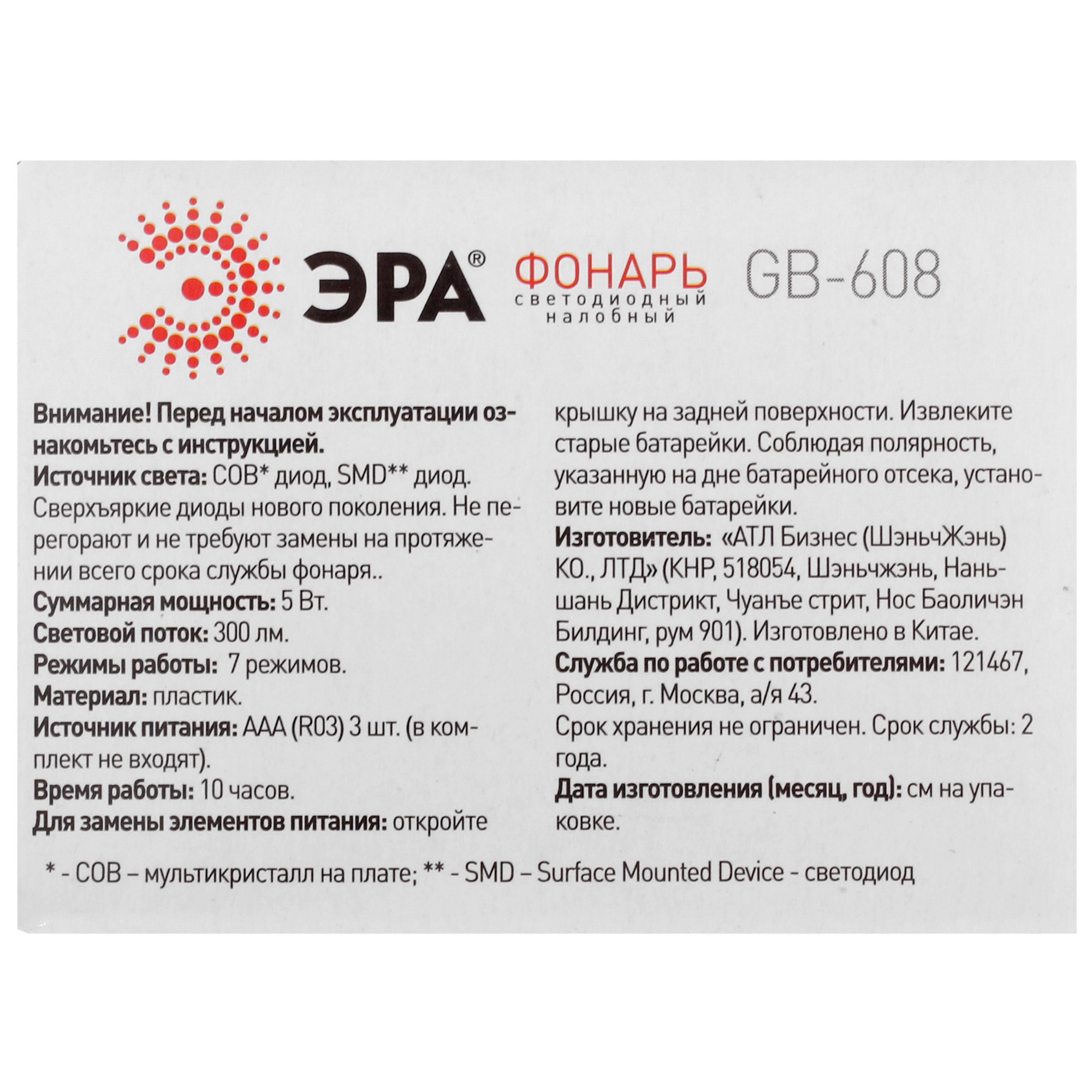 Фонарь ЭРА GB-608 надежно крепится на голове с помощью регулируемого по длине ремня. Он не доставляет неудобств даже при работе в течение многих часов подряд. Источник питания фонаря – 3 батарейки AAA. Их можно заменить аккумуляторами AAA. Максимальное время автономной работы фонаря – 10 ч.