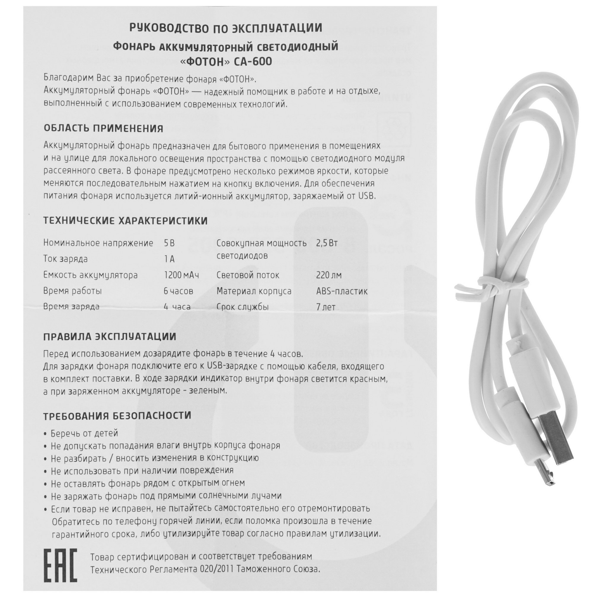 Фонарь со встроенным модулем рассеянного света обеспечивает равномерное освещения комнаты или пространства улицы. Фотон СA-600 получает питание от аккумулятора емкостью 1200 мА·ч. Он позволяет фонарю работать в течение 6 часов. Для подзарядки аккумулятора устройство подключается к USB-порту. При нажатии на кнопку включения происходит смена режимов яркости: всего предусмотрено 3 режима яркости.