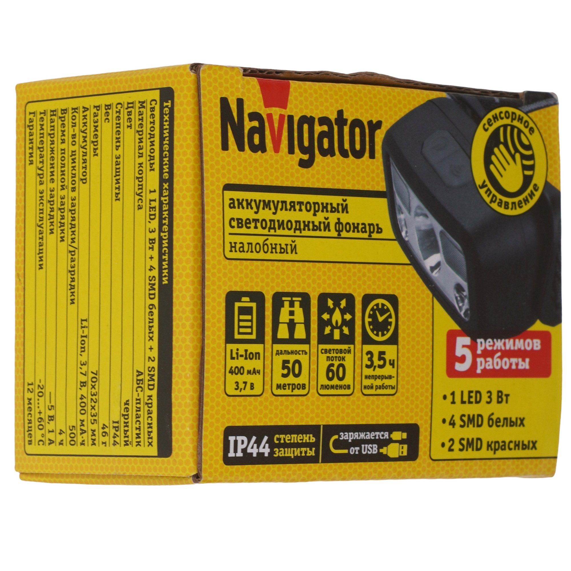 Фонарь Navigator NPT-H45-ACCU имеет налобное крепление и управляется с помощью кнопок и сенсора на корпусе. Уровень защиты IP44 позволит работать с ним на улице во время осадков и ветра. В комплекте поставляется аккумулятор, который при полной зарядке позволит работать до 3.5 ч. 7 светодиодов обеспечат 5 режимов работы в том числе мигающий режим и стробоскоп, чтобы вы могли подать сигнал бедствия. Дальность светового луча составляет 50 м.