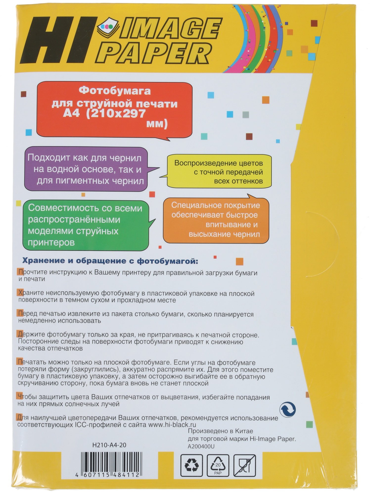 Бумага Hi-Black A200400U Фотобумага глянцевая односторонняя (Hi-image paper) A4, 210 г/м, 20 л. (H210-A4-20)