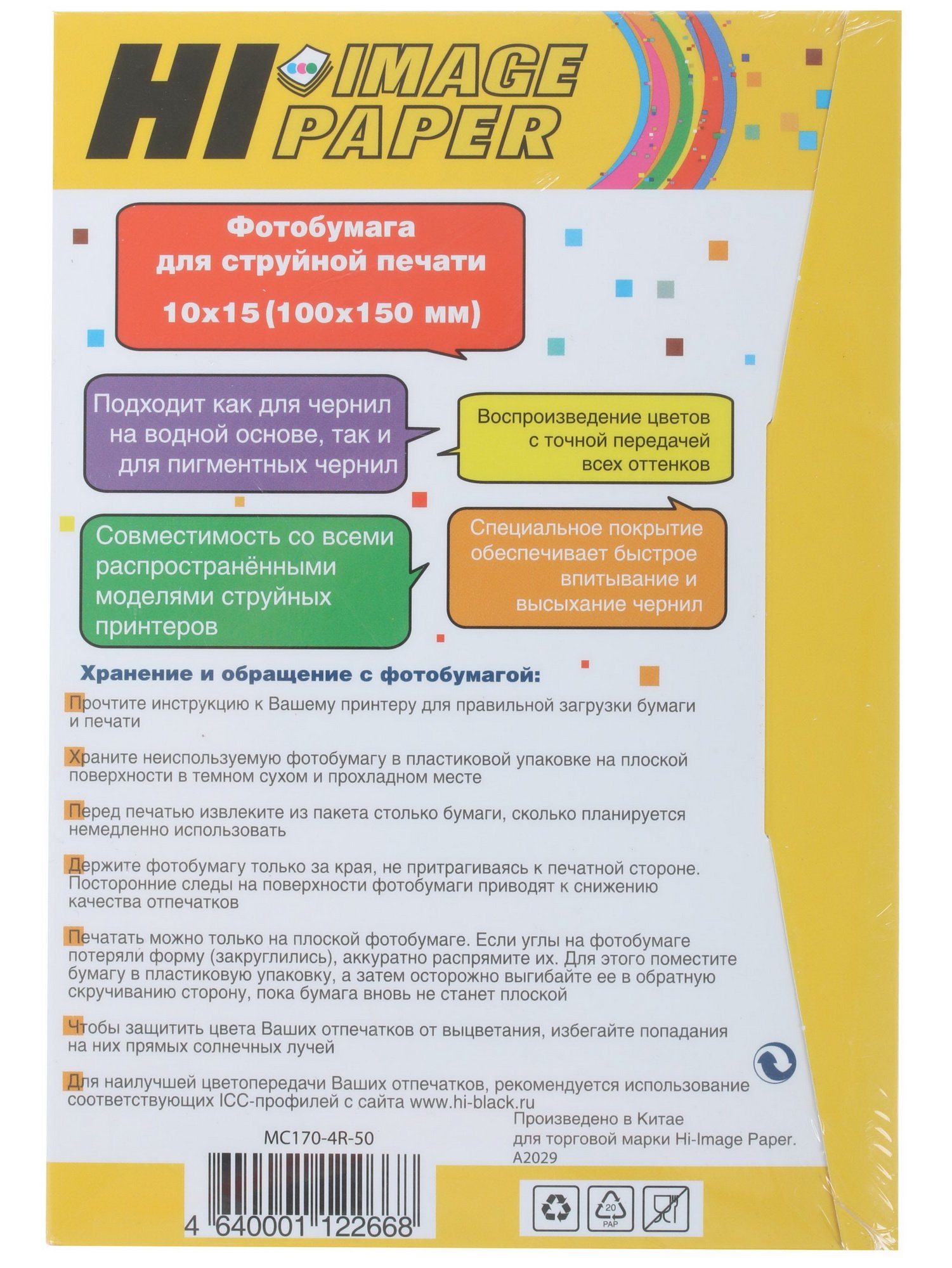 Фотобумага матовая односторонняя (Hi-image paper) 10x15, 170 г/м, 50 л.