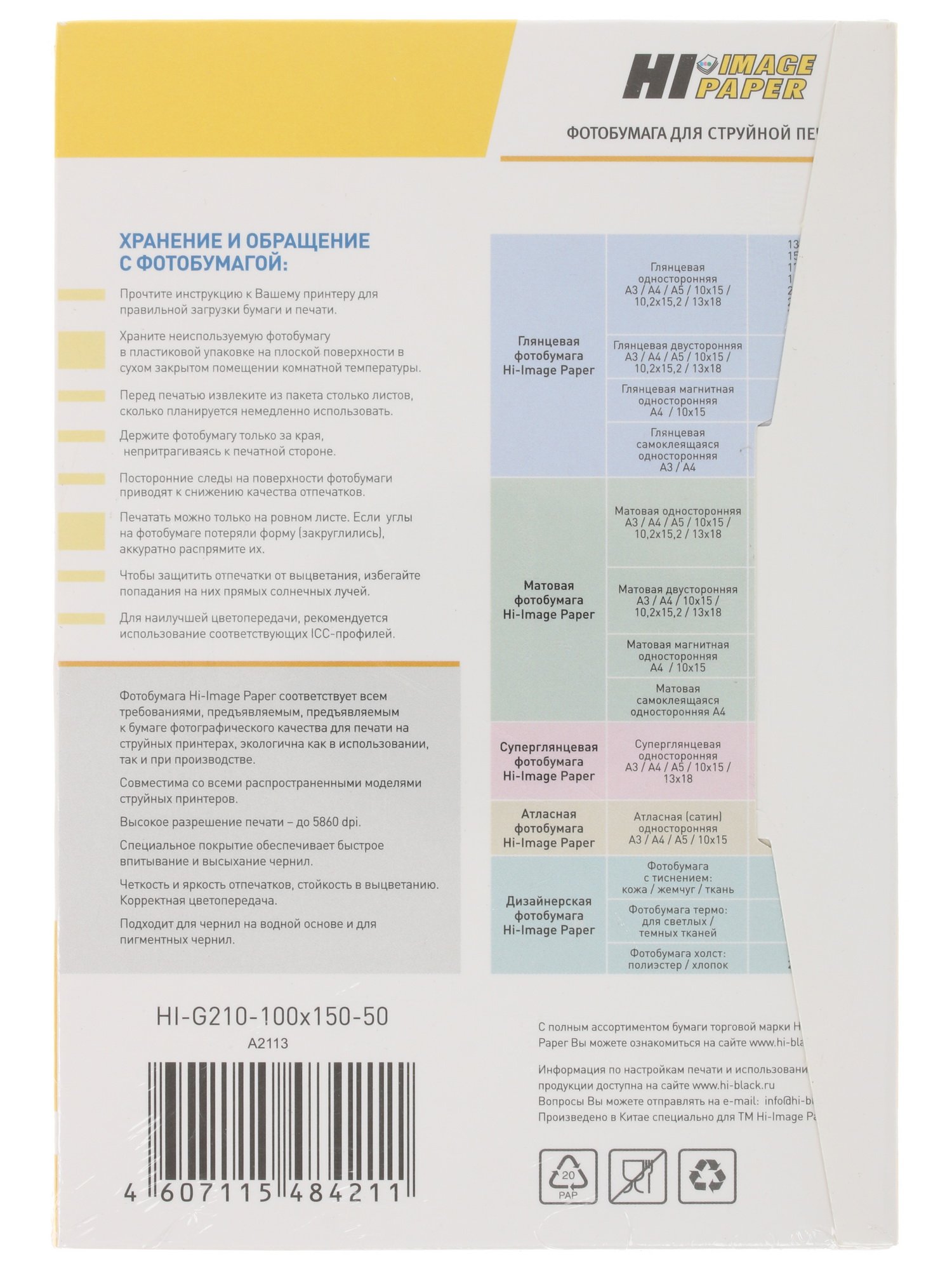 Бумага Hi-Black A2113 глянцевая односторонняя (Hi-image paper) 10x15, 210 г/м, 50 л. (H210-4R-50)