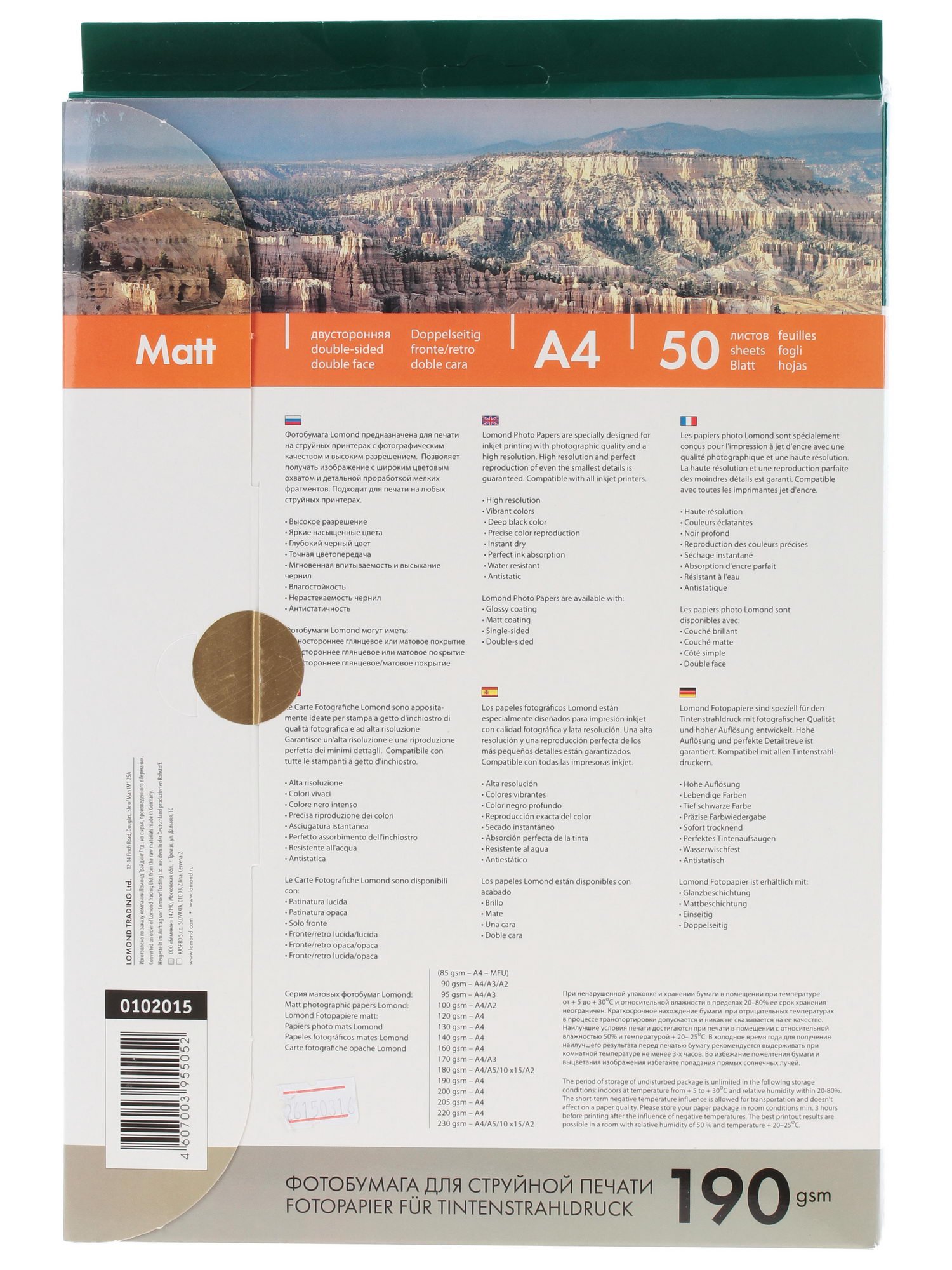Lomond 0102015 рассеивает свет под разными углами благодаря своему покрытию. Отпечатки, сделанные с помощью этого расходного материала, не бликуют на солнце, имеют высококонтрастность линий. Количество листов формата А4 в упаковке – 50. Плотность бумаги составляет 190 г/м².