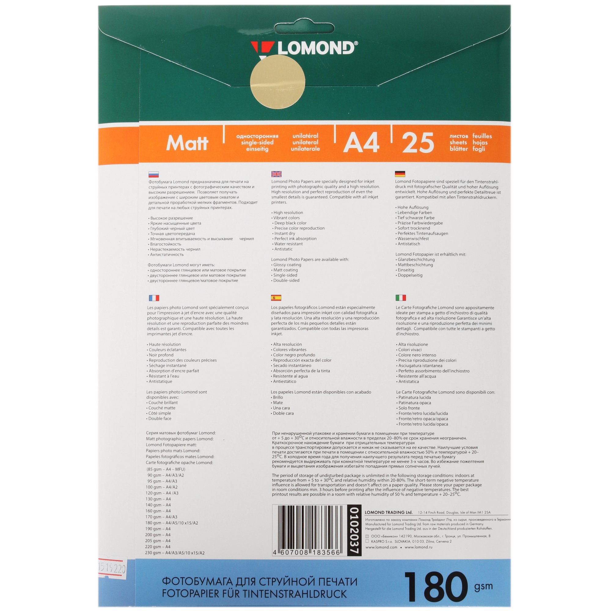 Фотобумага Lomond односторонняя матовая, 180г/м2, A4 (21X29,7)/25л. для струйной печати