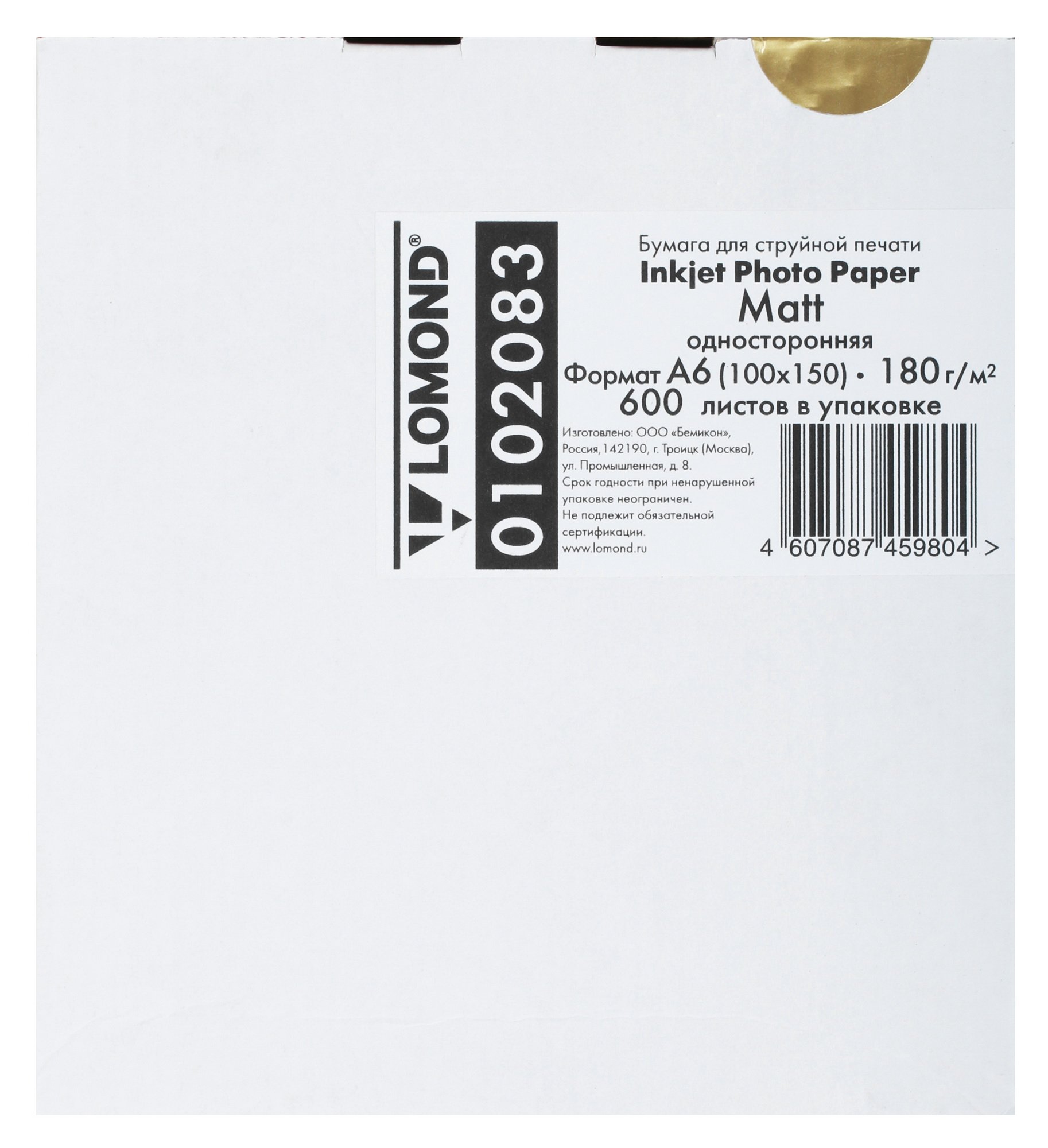 Фотобумага Lomond односторонняя матовая, 180г/м2, A6 (10X15)/600л. для струйной печати (технол.уп).