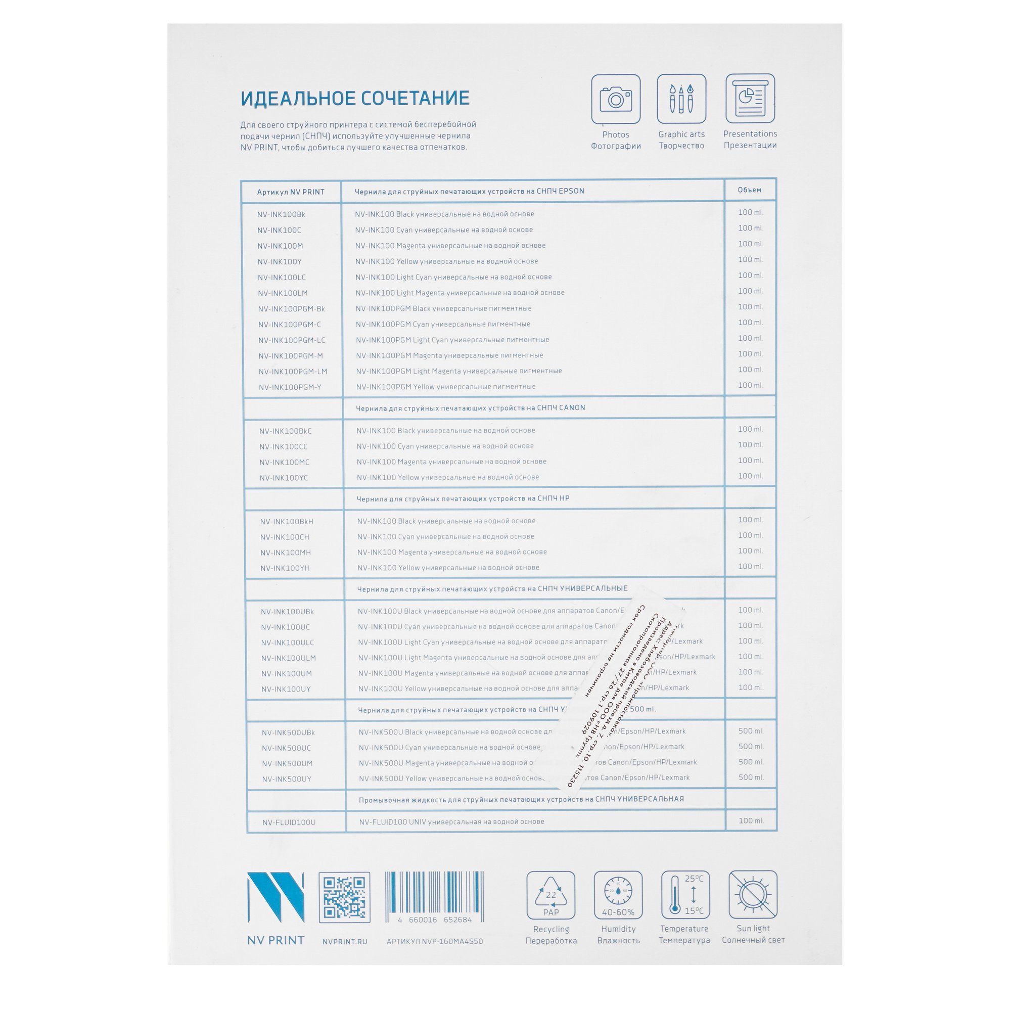 В пачке NV-Print NVP-160MA4s50 упаковано 50 листов стандартного формата A4 для печати одной большой фотографии или четырех фотокарточек в привычном размере 10x15 см. Бумага с оптимальной плотностью менее 200 г/м² не просвечивает и не дает чернилам растекаться.