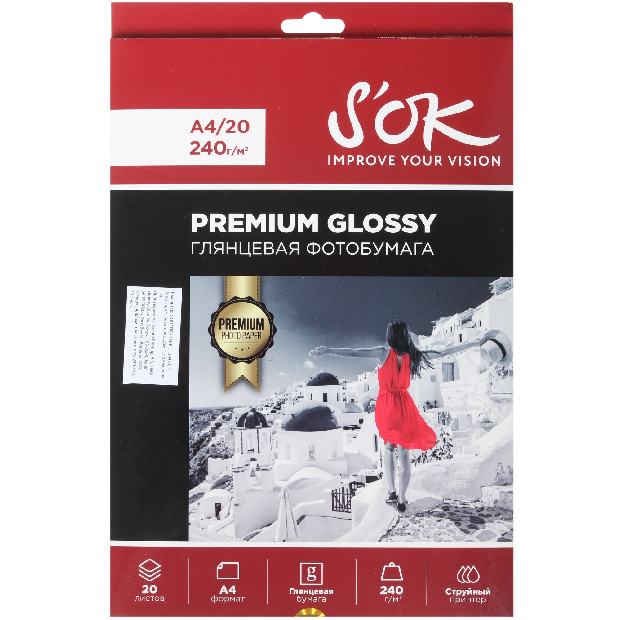 Premium S'OK A4 240г/м2 обладает плотностью 240 г/м², разрешением печати – 5760 dpi, в упаковке – 20 листов. Формат стандартный – A4 (210x297 мм), подходящий для большинства документов.