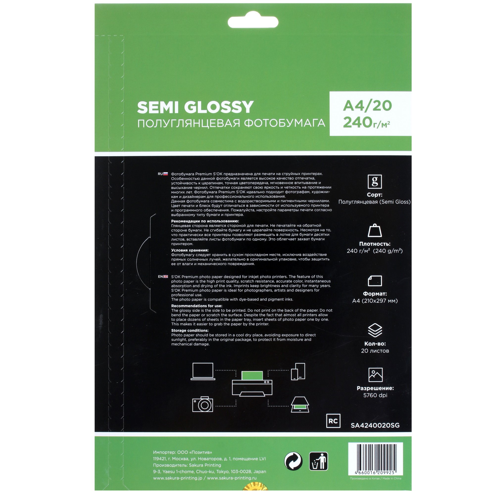 Фотобумага RC Semi Glossy Premium 240gsm; A4*20ПолуглянцеваяПремиум; 240г/м2; формат А4; 20 листов RC