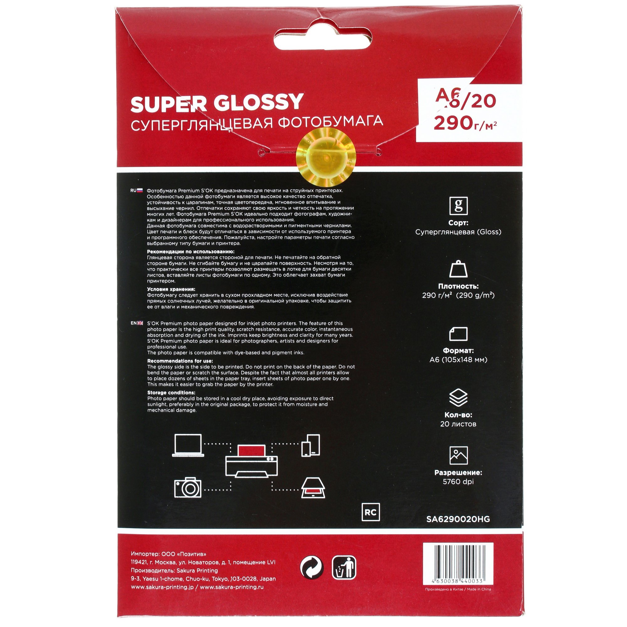 Формат Premium S'OK A6 290г/м2 – 105x148 мм, плотность составляет 290 г/м², что дает возможность сохранить форму листа, разрешение печати – 5760 dpi. Упаковка содержит 20 листов бумаги.