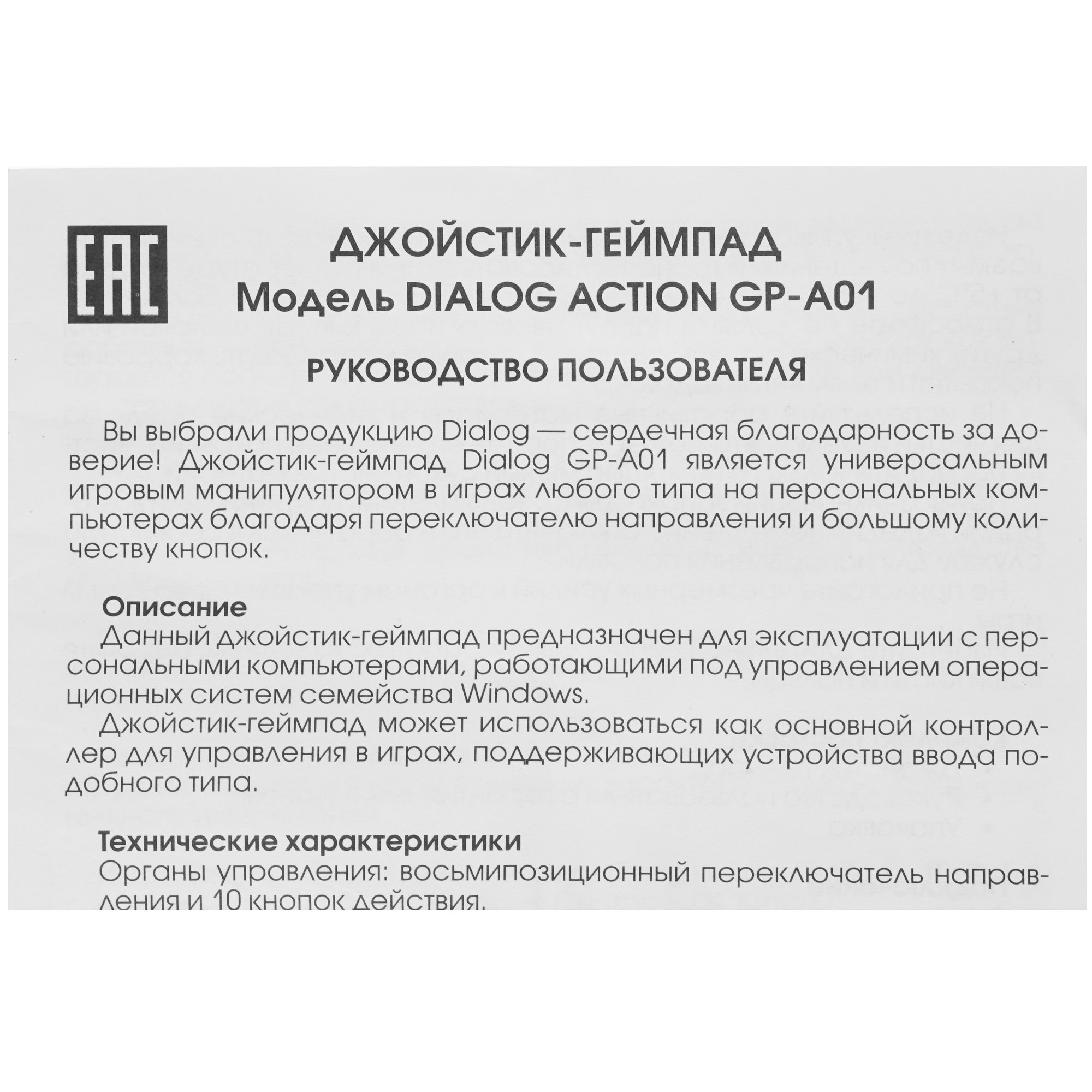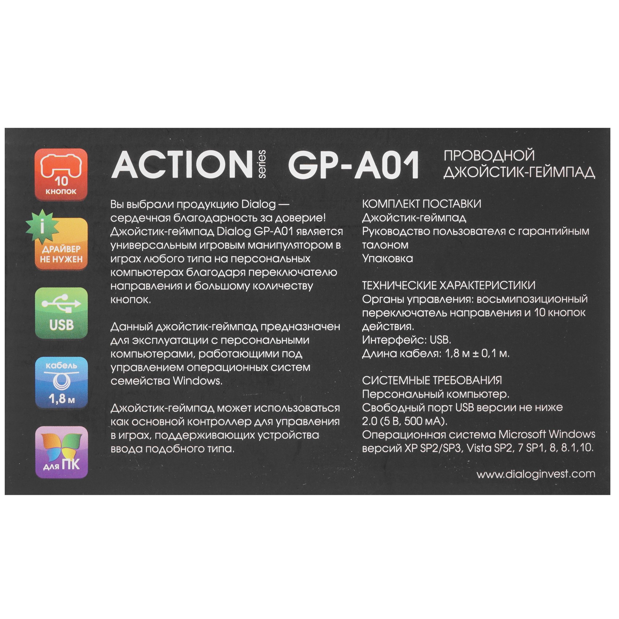Геймпад Dialog GP-A01 с подключением через проводной интерфейс USB обеспечивает широкую совместимость с компьютерами. Эргономичная конструкция способствует удобному управлению и высокому контролю над игровым процессом. Чувствительные кнопки быстро реагируют на нажатия. Всего имеется 11 кнопок, включая триггеры и D-Pad. Кабель синхронизации характеризуется длиной 1.8 м. Геймпад Dialog GP-A01 выполнен в прочном пластиковом корпусе и благодаря особой форме корпуса гарантирует комфорт в эксплуатации даже при длительных игровых сеансах.
