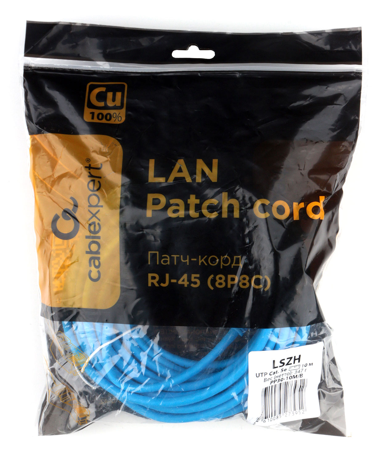 Патч-корд LSZH медный UTP Cablexpert PP30-10M/B кат.5e, 10м, литой, многожильный, синий