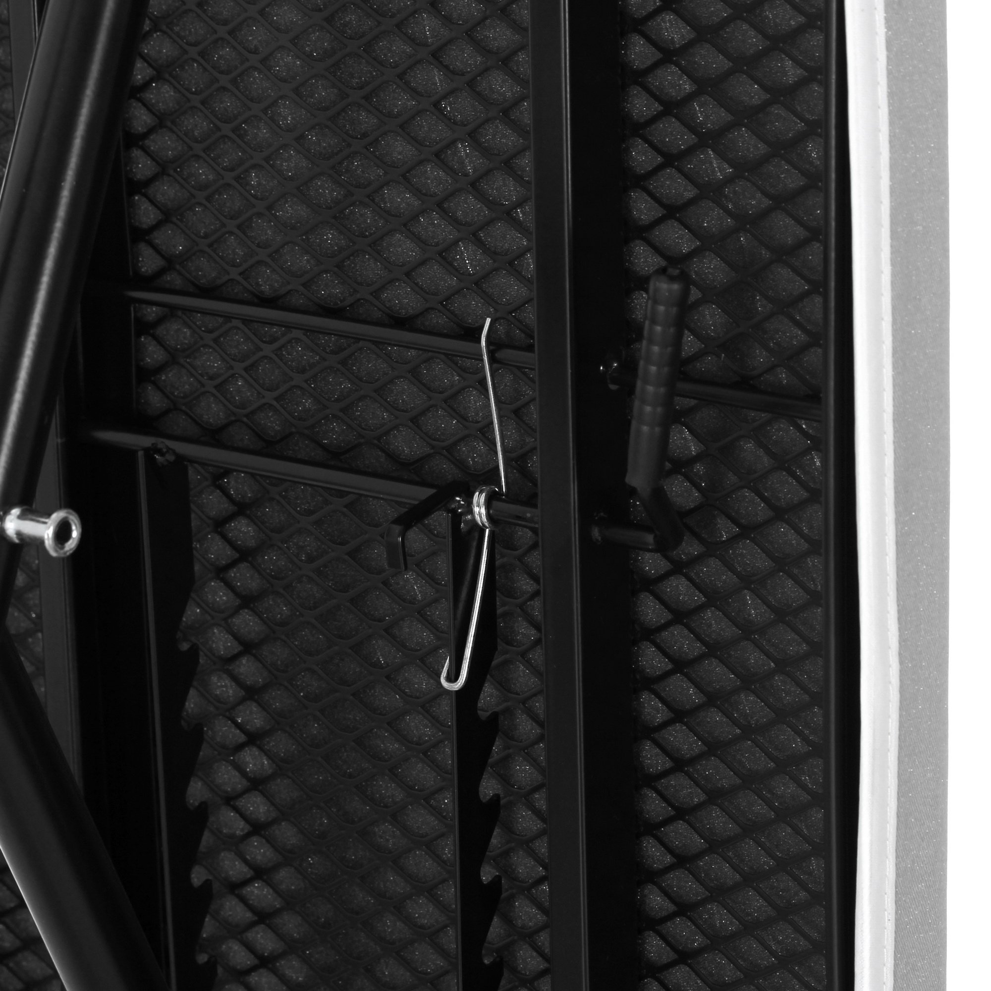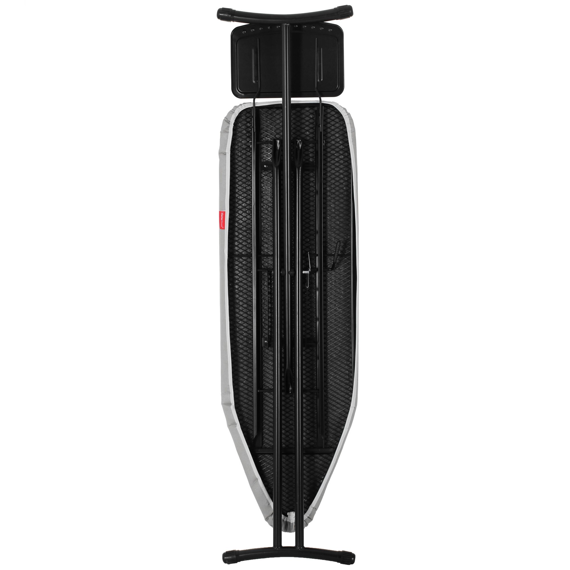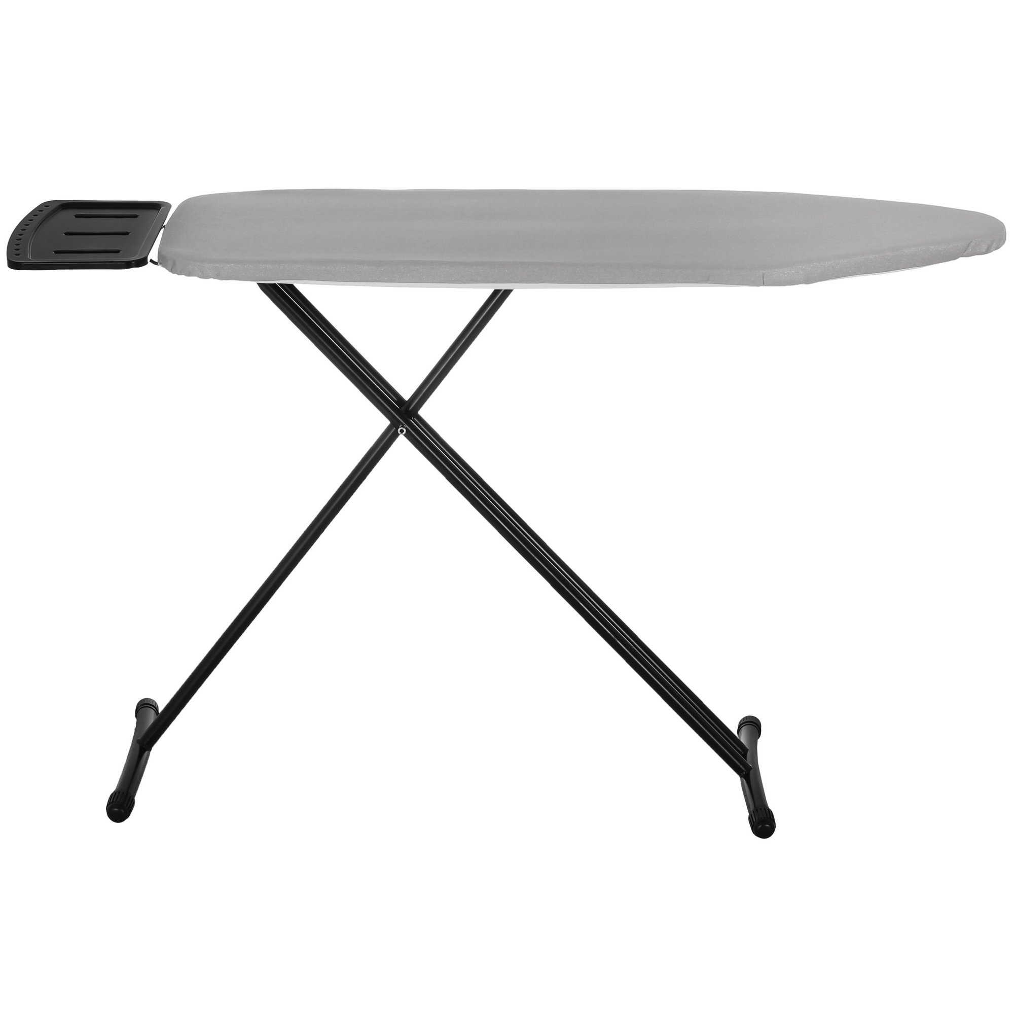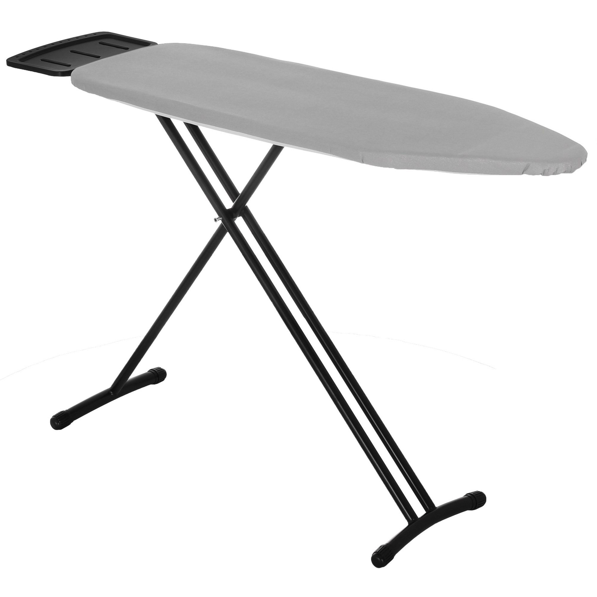 Гладильная доска Master House Баия-Бланка оснащена устойчивыми черными металлическими ножками. Есть рычаг для регулировки высоты конструкции в семи положениях. Основа в виде жесткой металлической сетки обеспечивает хорошую вентиляцию и тем самым ускоряет высыхание влажного белья во время глажки. Доска выдерживает нагрузку до 40 кг.