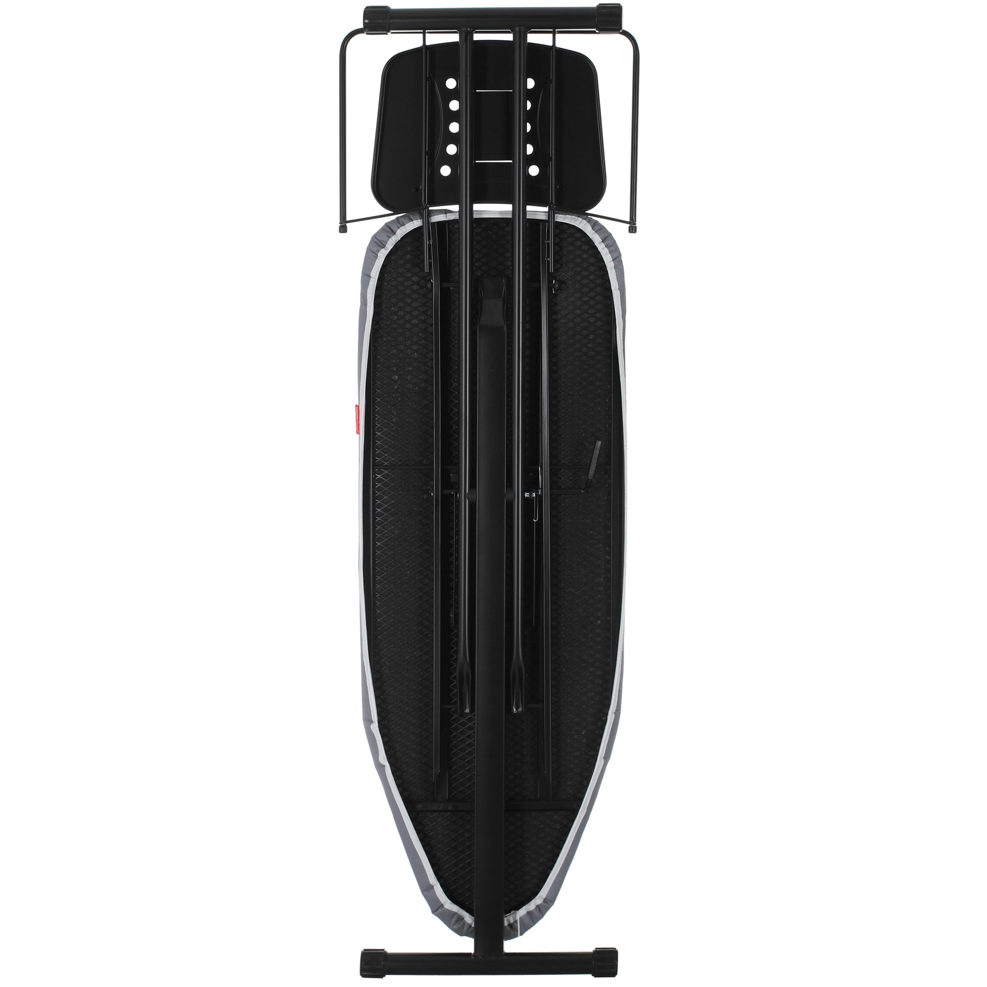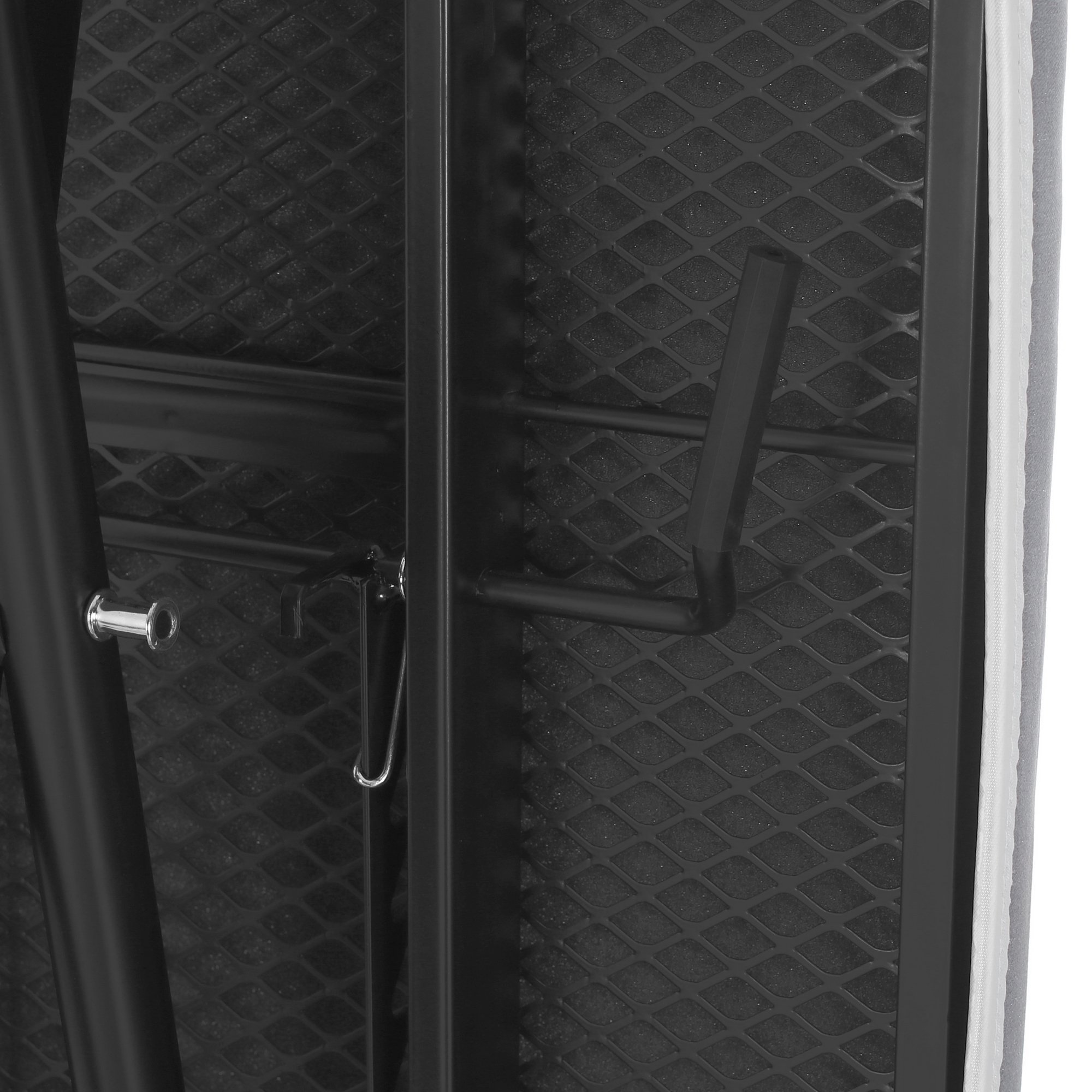 Гладильная доска Master House Росарио оснащена устойчивыми черными металлическими ножками. Есть рычаг для регулировки высоты конструкции в семи положениях и стопер с кнопкой для защиты от случайного складывания. Основа в виде жесткой металлической сетки обеспечивает хорошую вентиляцию и тем самым ускоряет высыхание влажного белья во время глажки. Доска выдерживает нагрузку до 40 кг.