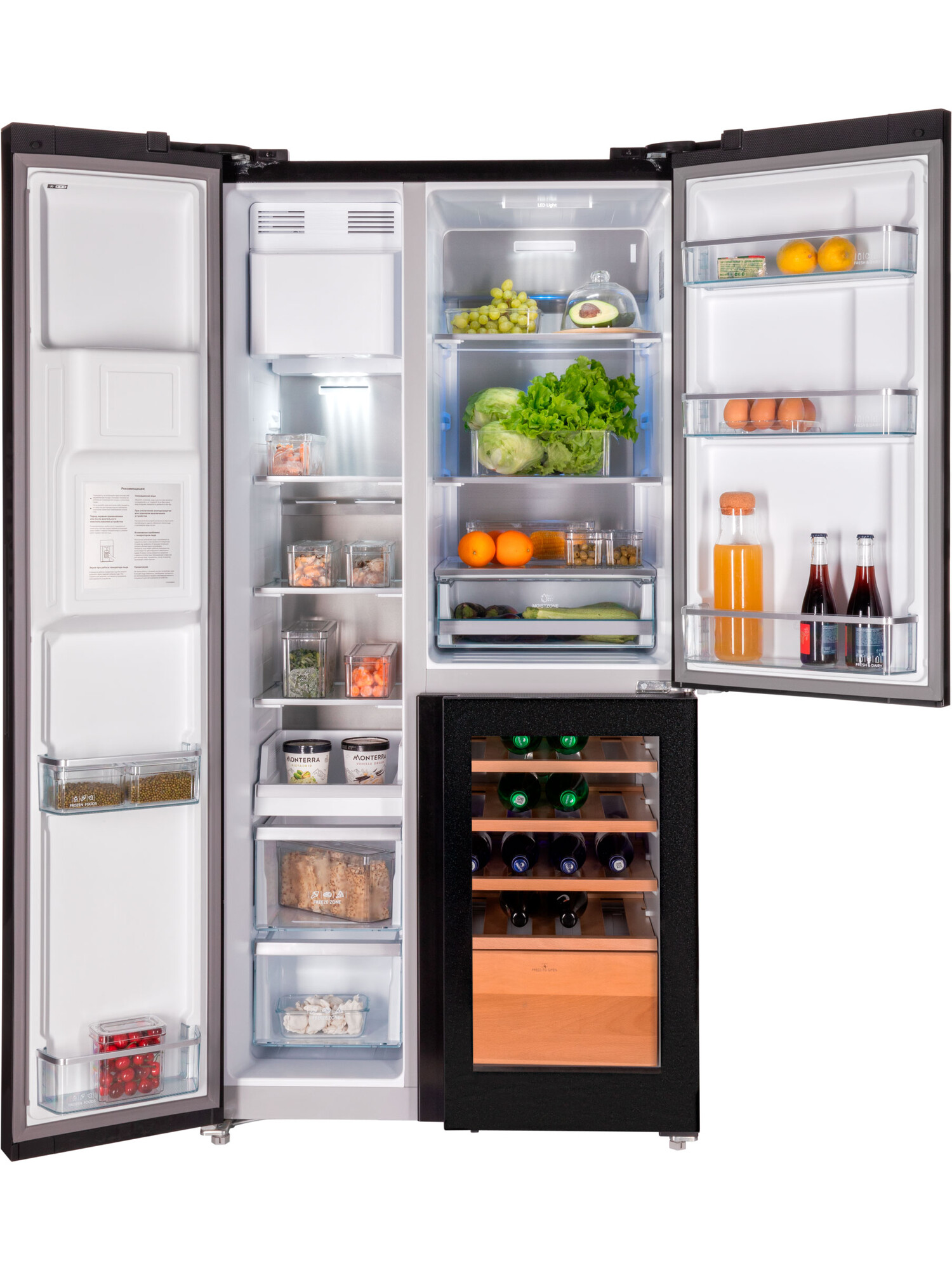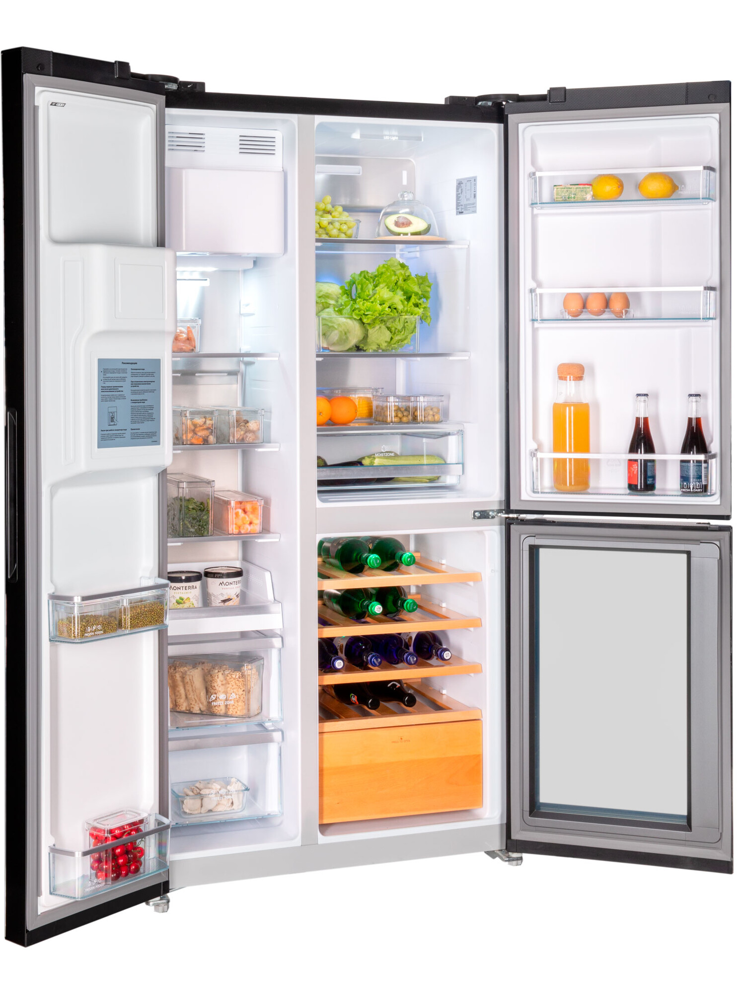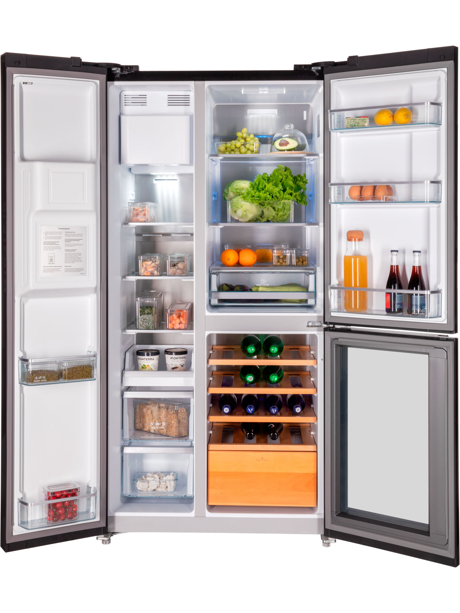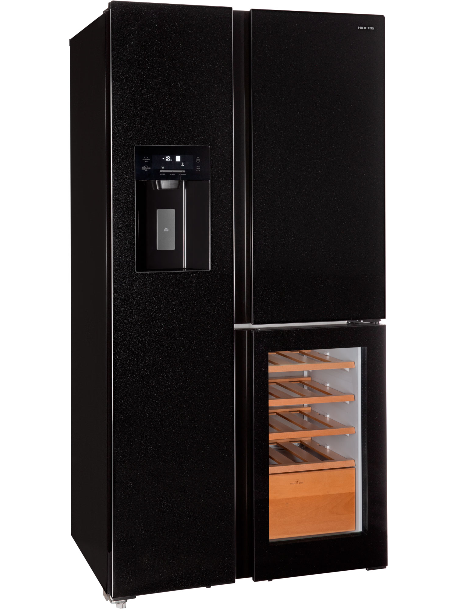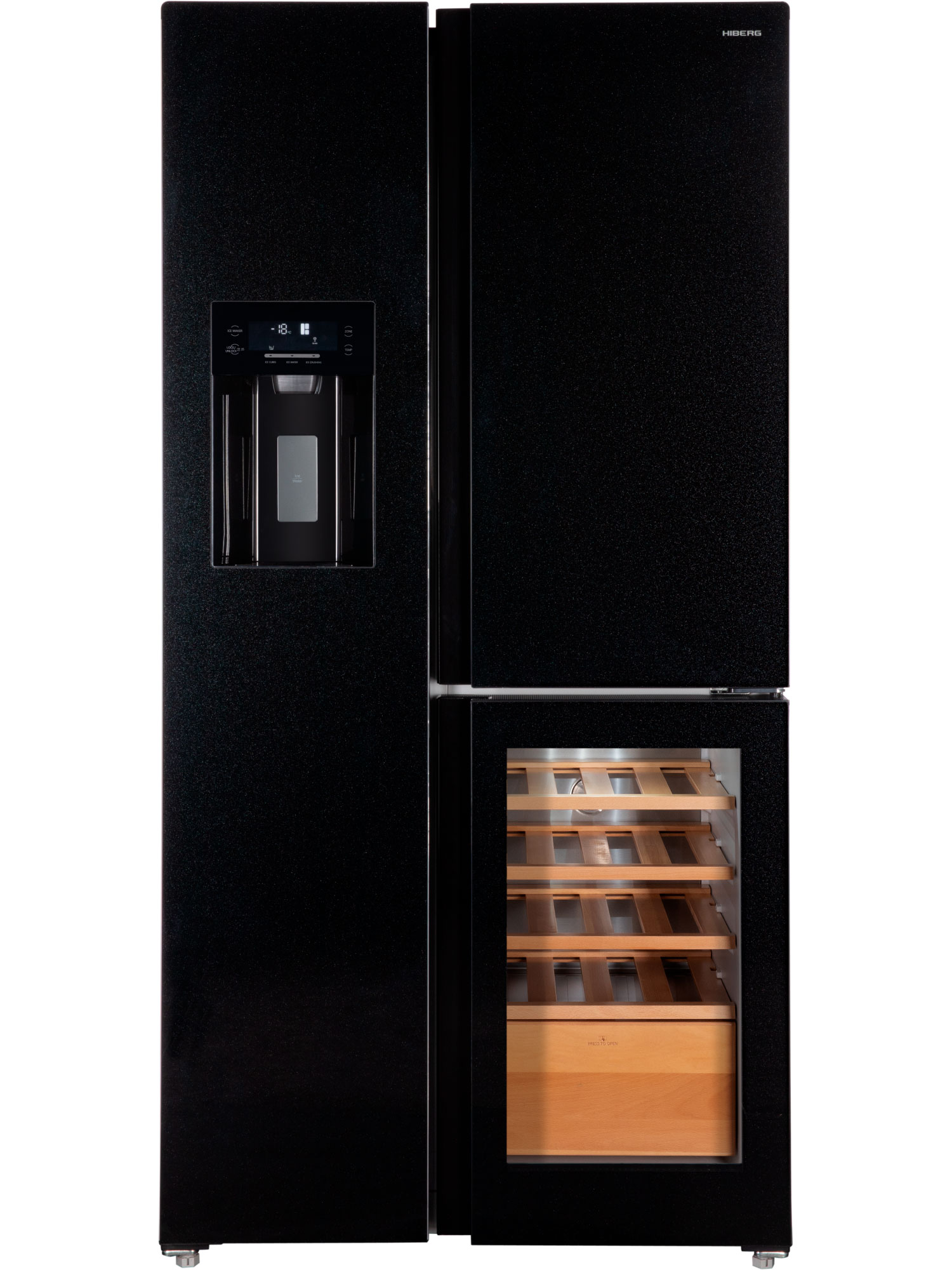 Отдельностоящий холодильник HIBERG RFS-750G Side-by-Side с винным отделением и автоматическим ледогенератором работает с помощью инновационных технологий охлаждения и замораживания, которые дольше сохраняют свежесть продуктов. Вместительная модель изысканного цвета «черное мерцающее стекло» станет украшением вашей кухни в просторной квартире или частном доме. Общий объем холодильника составляет 584 литра. Роскошный HIBERG i-RFS 750G B со встроенным винным отделением — то, что нужно ценителю хорошего вина. В модели предусмотрены три режима настройки температуры для шампанского, белого и красного вина, что позволяет правильно хранить каждый напиток в соответствии с его особенностями. Полки и выдвижной ящик, выполненные из бука, обеспечивают удобное размещение бутылок и легкий доступ к ним. Стеклянная дверца отделения с защитой от УФ-лучей позволяет поддерживать оптимальные условия хранения вина и предотвращает его порчу. Благодаря встроенному винному отделению вы сможете не только в любой момент наслаждаться изысканными и благородными спиртными напитками, но и удивить гостей своим прекрасным вкусом. Утолить жажду в жаркий день поможет встроенный диспенсер, который выдает чистую холодную воду. Автоматический ледогенератор обеспечивает постоянную подачу льда в двух вариантах — кубиках и крошке. Устройство напрямую подключается к водопроводу и способно производить до 1,5 кг льда в сутки. Первую партию льда можно получить уже через несколько часов. Наличие диспенсера со съемным фильтром позволяет выдавать чистую холодную воду, колотый лед или ледяные кубики.