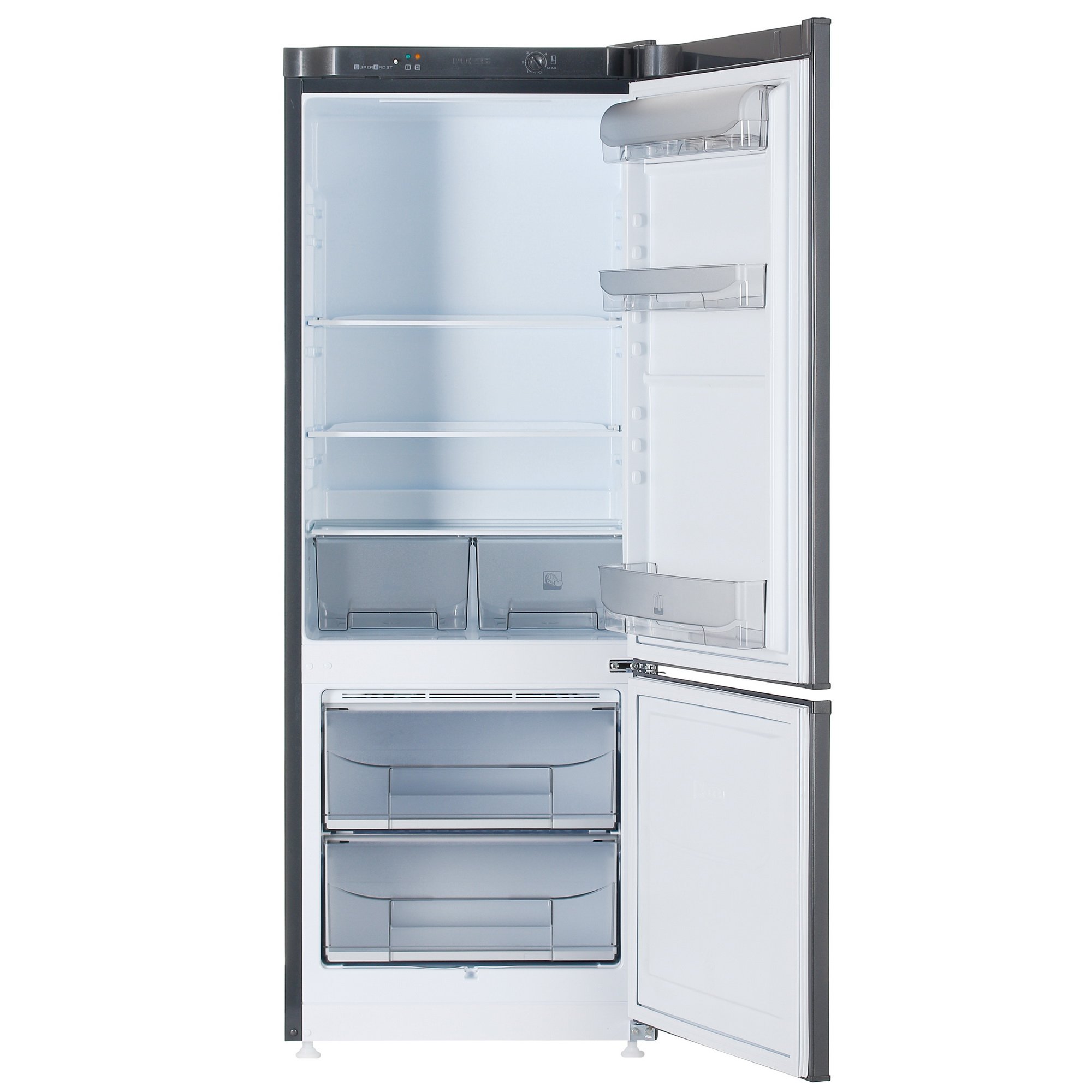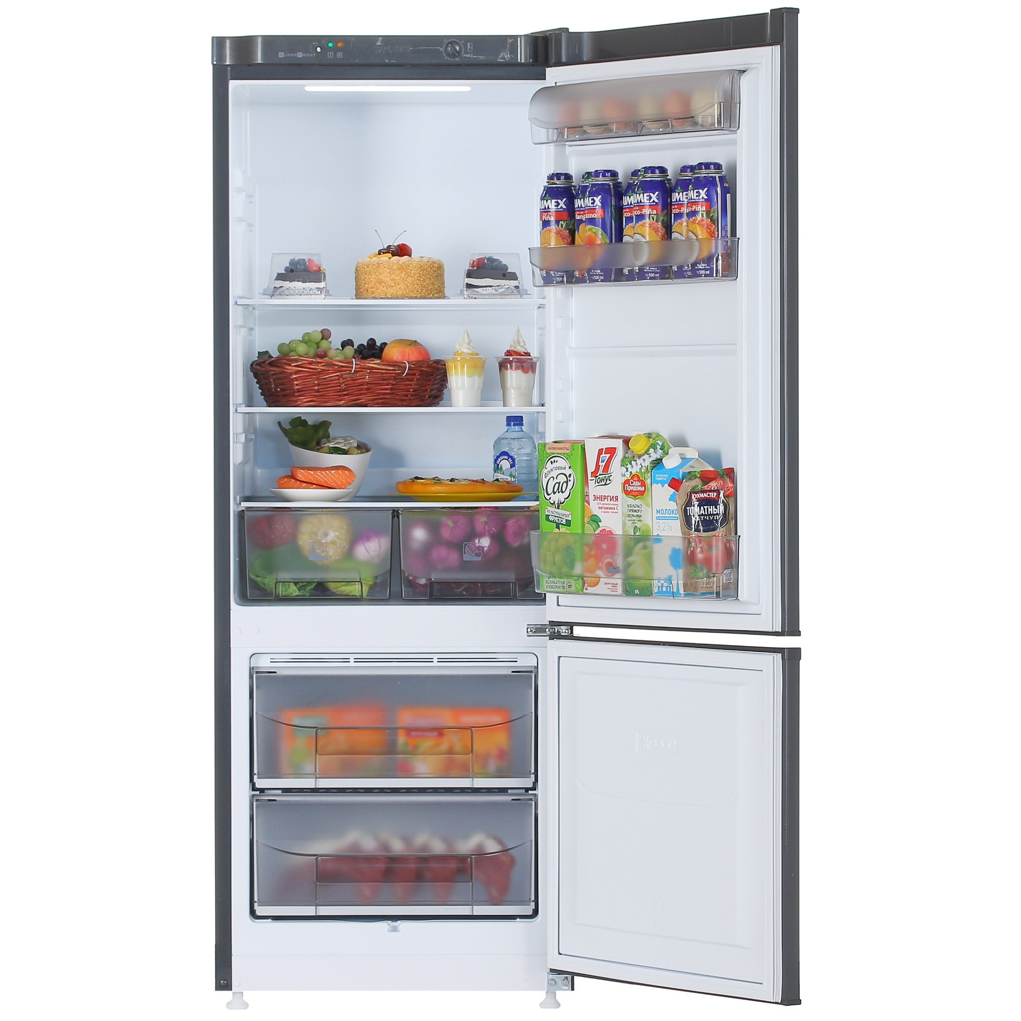 Холодильник с морозильником Pozis RK-102 при высоте 162 см обладает 245 л полезного объема, из которых 57 приходится на морозильную камеру. Все ее пространство занимают 2 цельнолитых прозрачных пластиковых ящика. В них удобно разделить продукты по видам, например, мясо и рыбу, или сырые и полуфабрикаты. Температура в нем может опускаться до -18 °C, что позволяет продлить сроки хранения до максимума.
