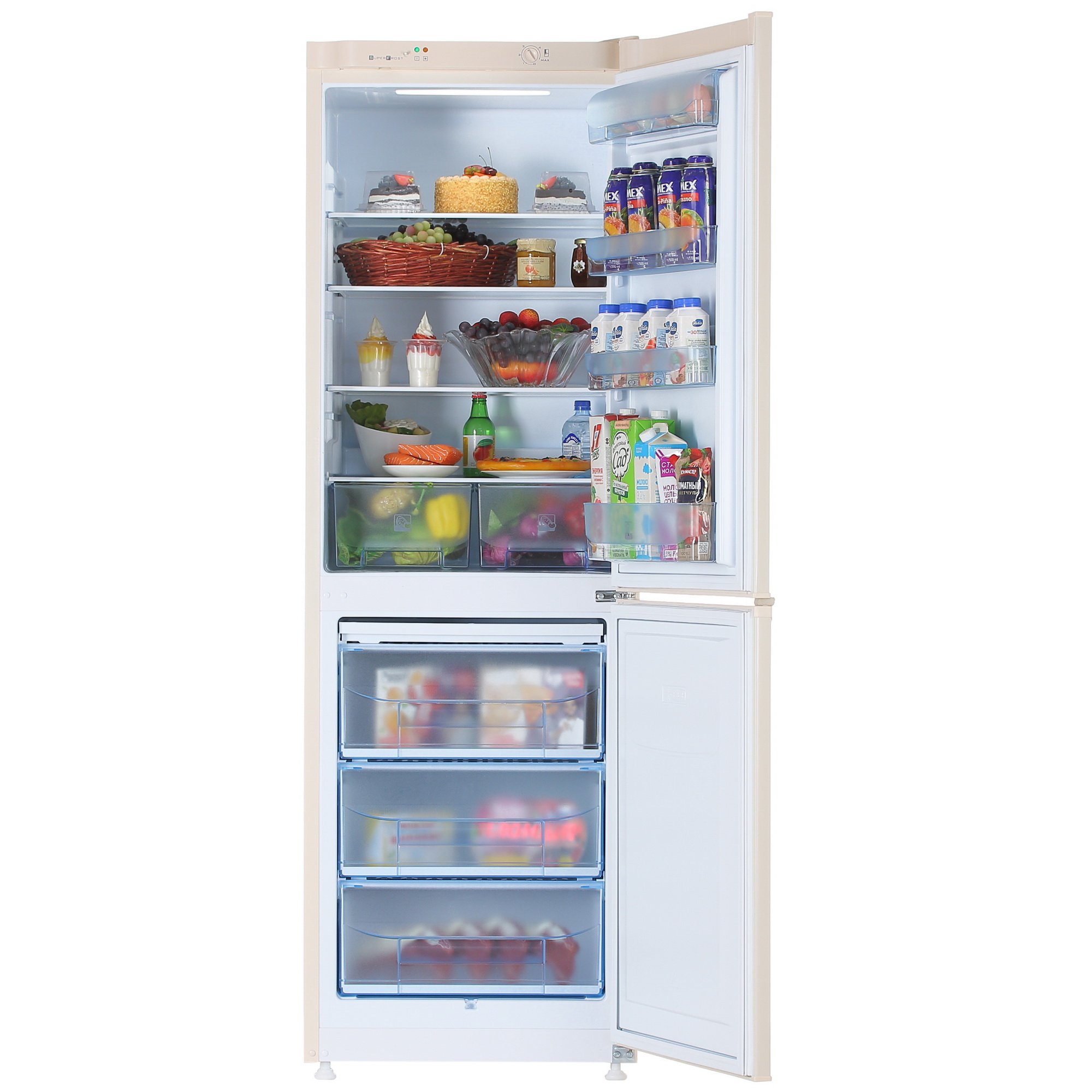 Холодильник с морозильником Pozis RK-139 имеет достаточно необычную для кухонных бытовых приборов бежевую расцветку. Его высота (185 см) и наличие 4 полок внутри, которые сочетаются с 2 выдвижными ящиками для овощей и фруктов, указывают на солидную вместительность прибора.