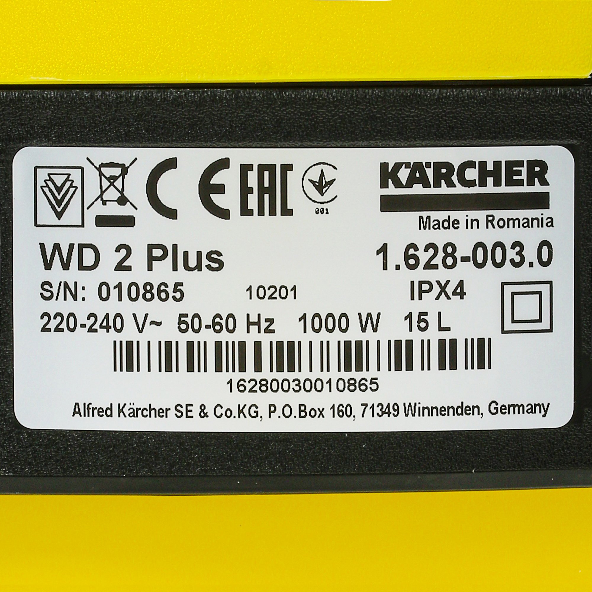 Строительный пылесос Karcher WD 2 V-15/4/18 желтый, 180/1000 Вт, уборка сухая/влажная, пылесборник мешок/контейнер, 15 л
