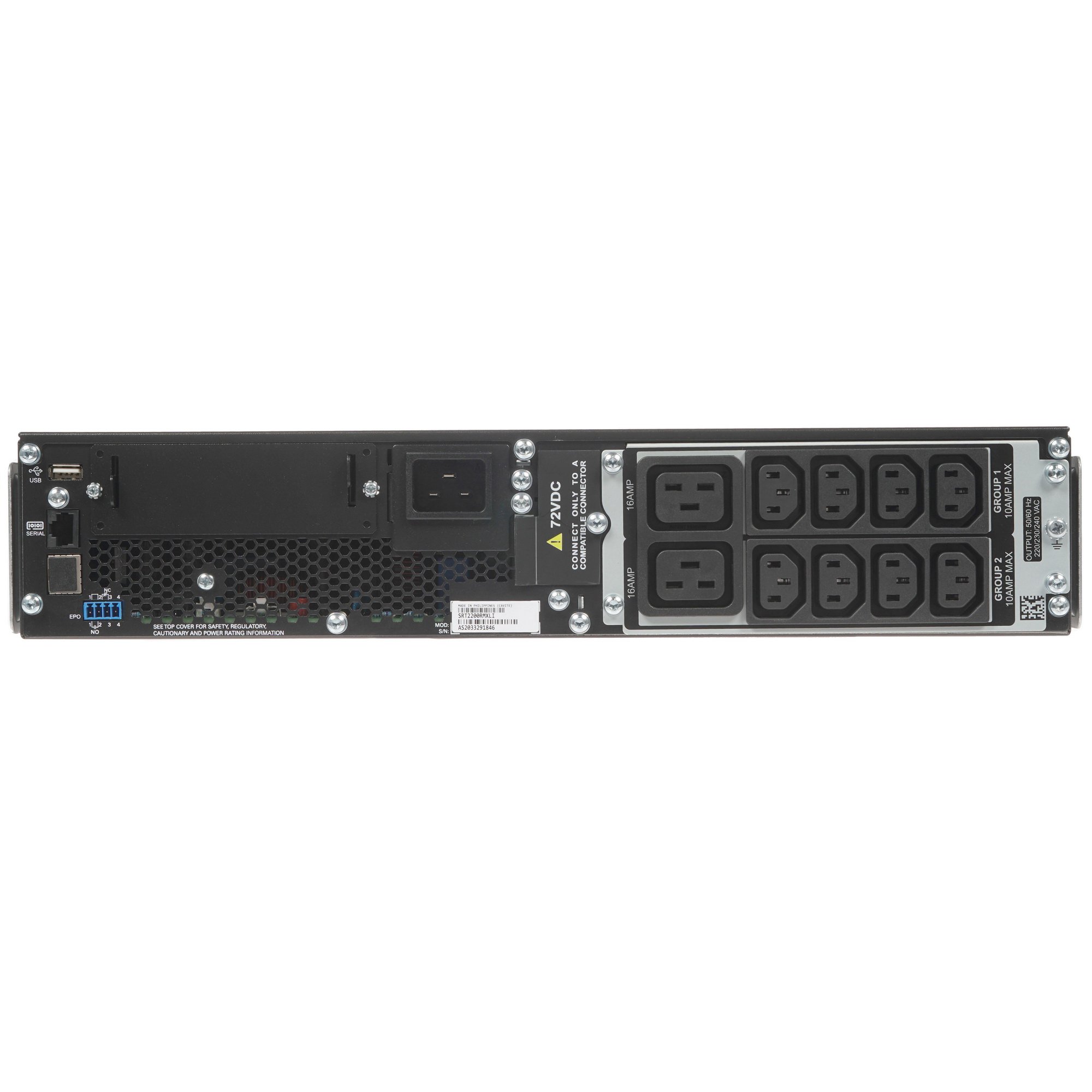 Конструкция корпуса APC Smart-UPS SRT 2200VA [SRT2200RMXLI] предполагает наличие восьми компьютерных разъемов IEC 320 C13 и двух разъемов IEC 320 C19 для подключения оборудования. Также имеются интерфейсы USB и SmartSlot. При приближении момента отказа батареи ИБП информирует об этом пользователя, чтобы тот смог вовремя осуществить профилактическое обслуживание. На графическом ЖК-дисплее устройство отображает информацию о режиме работы, аварийных сигналах и параметрах системы.