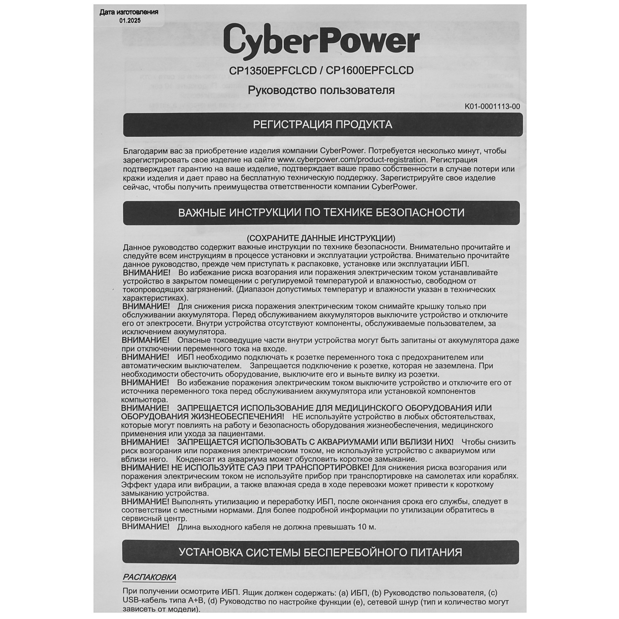 Источник бесперебойного питания Cyberpower CP1600EPFCLCD Line-Interactive 1600VA/100W USB/RS-232/RJ11/45 (6 EURO)