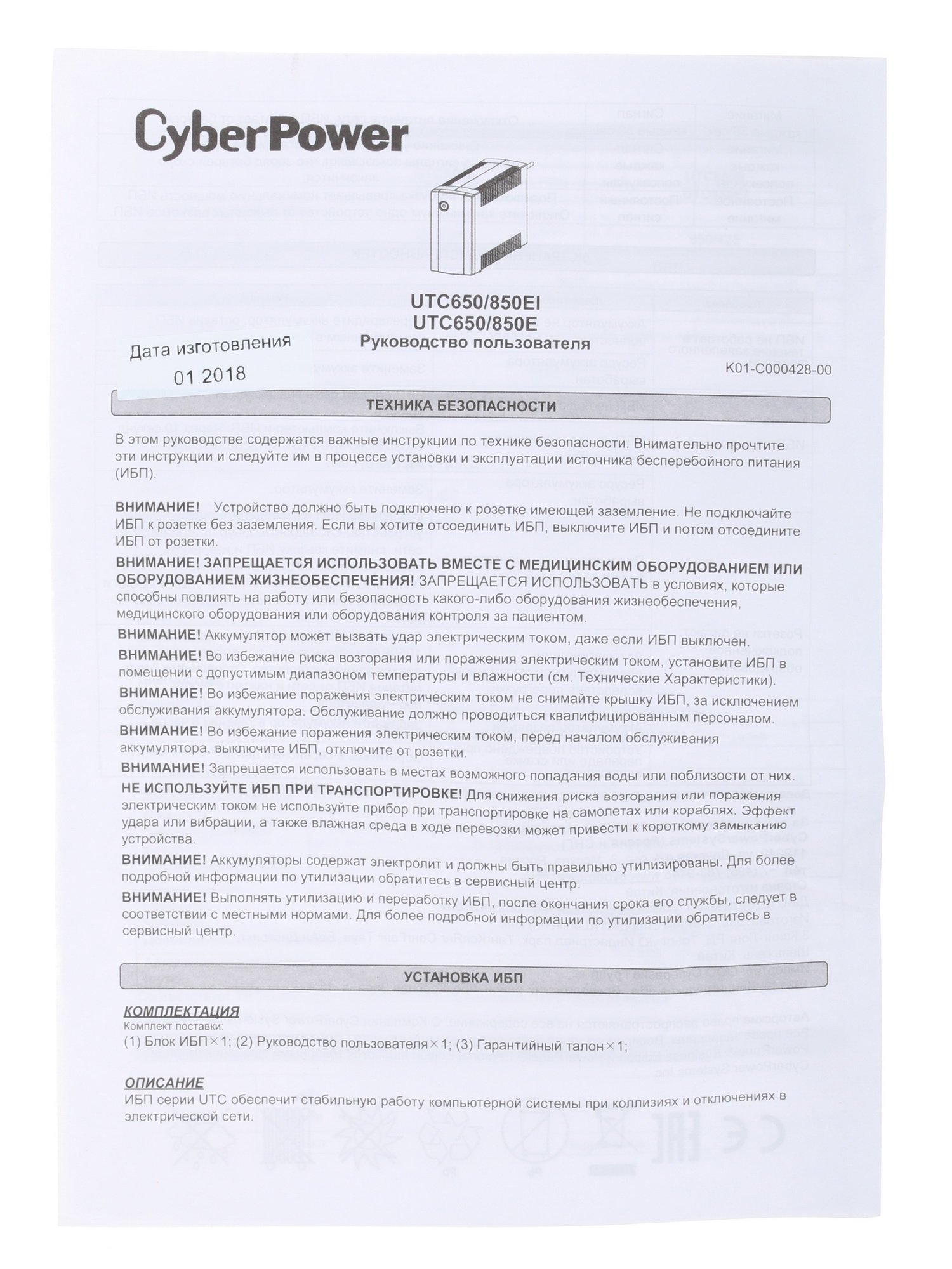 Источник бесперебойного питания CyberPower Line-Interactive UTC850E 850VA/425W (2 EURO)