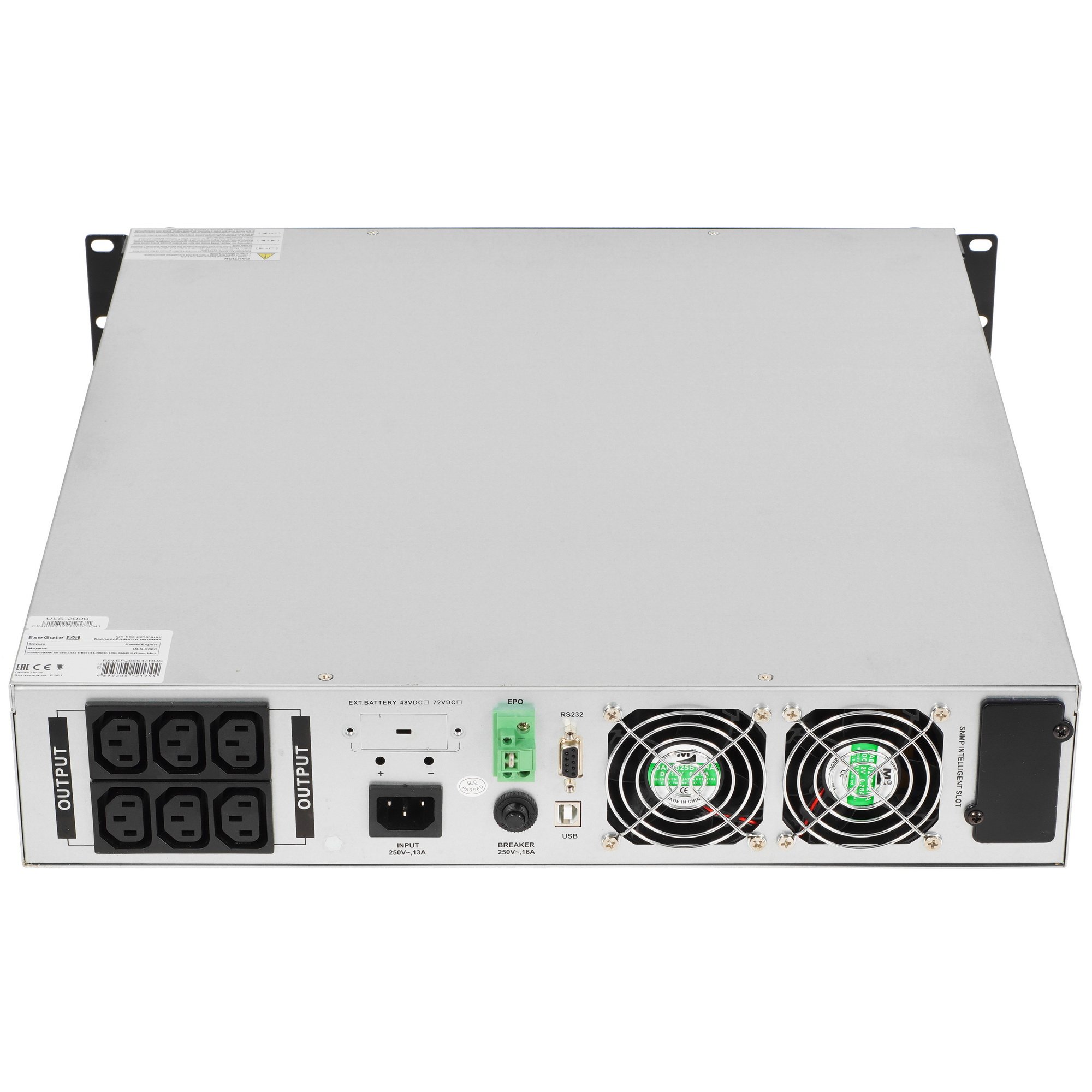 Для подключения нагрузки ExeGate PowerExpert ULS-2000.LCD.AVR.C13.USB.RS232.SNMP.2U используются шесть разъемов IEC 320 C13, которые размещены так, чтобы ИБП можно было установить в стойку. Также ИБП предусматривает наличие разъемов RS-232 и USB. Внутри его корпуса установлено 6 свинцово-кислотных батарей с мгновенным переключением. Они обеспечивают работу оборудования в течение 3.8 минут при максимальной нагрузке, когда аппарат выдает 2000 Вт. Для удобства контроля над состоянием аппарата имеется LCD-табло.