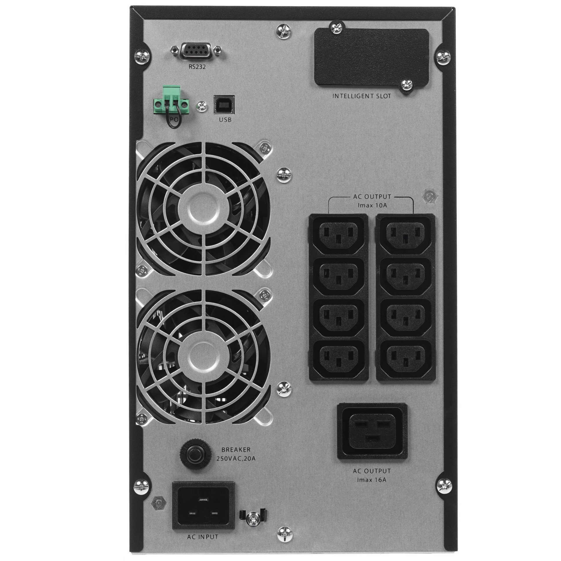 ИБП IPPON Innova G2 3000 предназначен для защиты оборудования, требовательного к качеству электропитания, от скачков напряжения, перегрузок и короткого замыкания. Данная модель ИБП с двойным преобразованием легко справляется с напряжением в диапазоне 113 - 300 В, создавая на выходе сигнал с чистой синусоидой, так необходимый серверам и рабочим станциям. Подключение оборудования к ИБП происходит через выходные разъемы (8 штук формата IEC 320 C13) на его задней панели. Там же расположены интерфейсы EPO, RS-232, слот для SNMP, USB.
