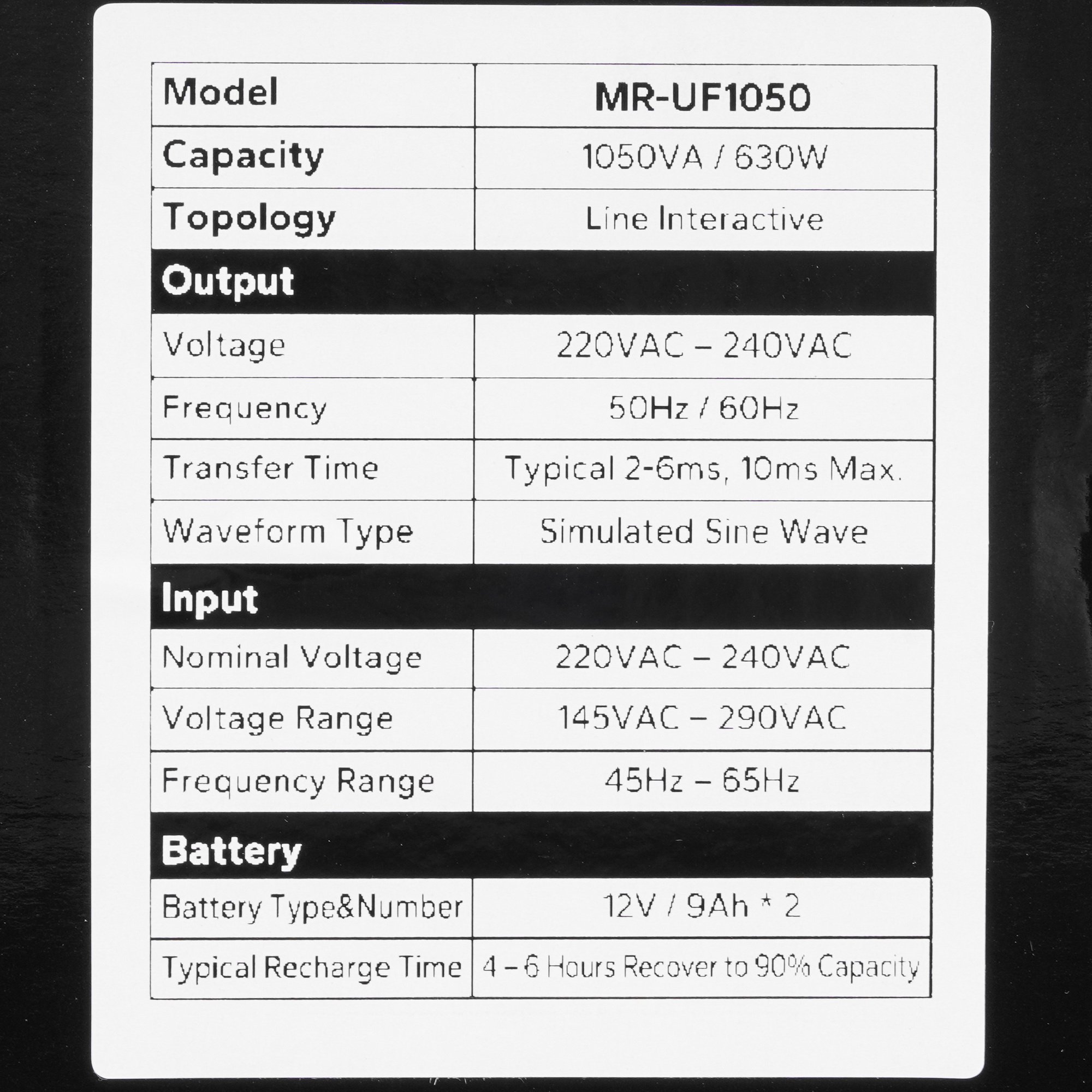 ИБП MARSRIVA MR-UF1050 с черным корпусом относится к линейно-интерактивному типу и обеспечивает работу подключенной нагрузки некоторое время в случае отключения централизованного электроснабжения. Защищенный от короткого замыкания, перегрузки и перезаряда источник питания отличается эффективной выходной мощностью 600 Вт. Для подключения электропотребителей эта модель предлагает две выходные евророзетки.