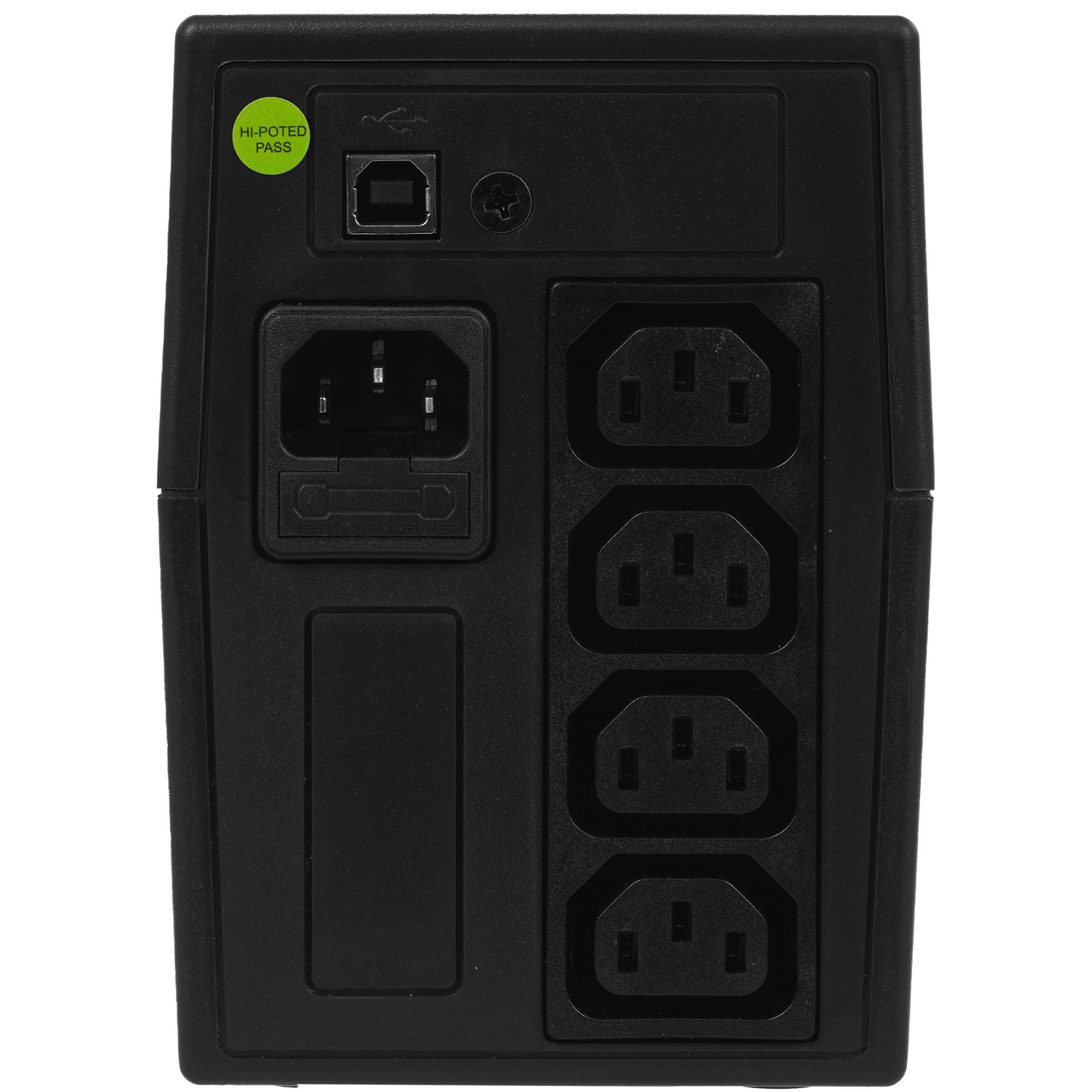 Powerman Back Pro 850I Plus представлен в вертикальном исполнении ‒ в форм-факторе Tower. Такой корпус устанавливается на пол и удобен для подключения потребителей. Для этого на его лицевой стороне выполнены 4 разъема IEC 320 C13. Для взаимодействия с устройствами модель использует интерфейс USB. При коротком замыкании и перегрузки аппарата срабатывает автоматический выключатель. Он не позволяет ИБП выйти из строя.
