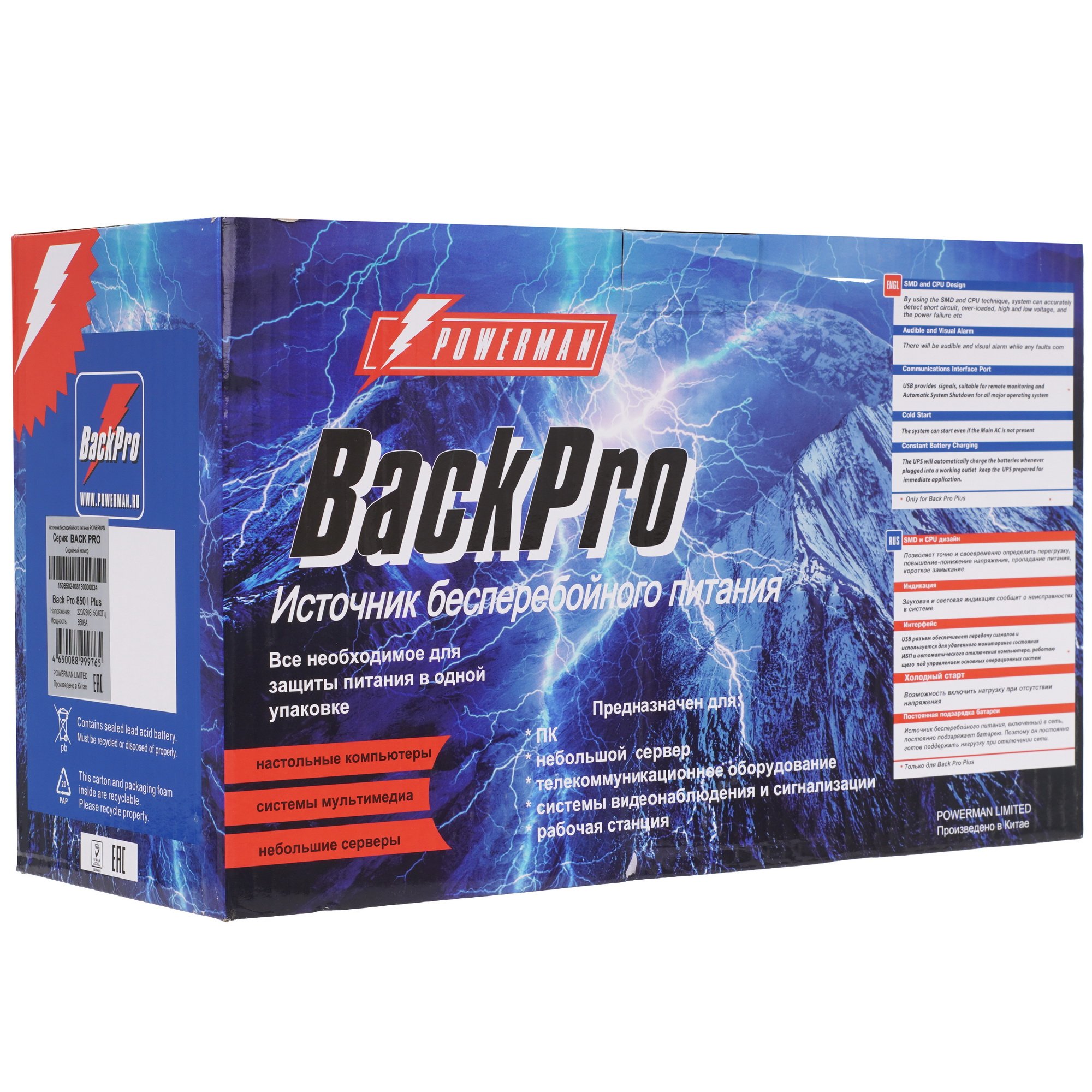 ИБП Powerman Back Pro 850I Plus представляет собой линейно-интерактивный источник питания для дома и офиса. Устройство в офлайн-режиме защищает от колебаний напряжения, получая питание от сети. Модель рассчитана на подключение бытовой и компьютерной техники общей мощностью 480 Вт (850 ВА). ИБП использует свинцово-кислотную батарею мощностью 12V/9Ah, на которую при скачках напряжения он переключается за 4 мс. В состоянии покоя прибор автоматически заряжает батарею.