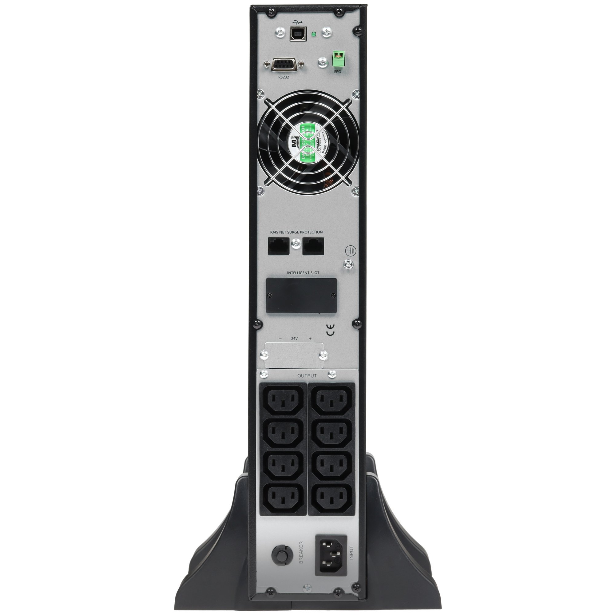 На передней панели расположены цифровой дисплей и светодиодные индикаторы для визуального контроля параметров работы. В ИБП установлены 8 компьютерных розеток стандарта IEC 320 C13. Дополнительно предлагаются разъем аварийного отключения питания EPO, интерфейсы RS-232 и USB под периферийные устройства, слот для платы расширения SNMP. Поддерживается подключение 2 внешних свинцово-кислотных аккумуляторов с напряжением 12 В.