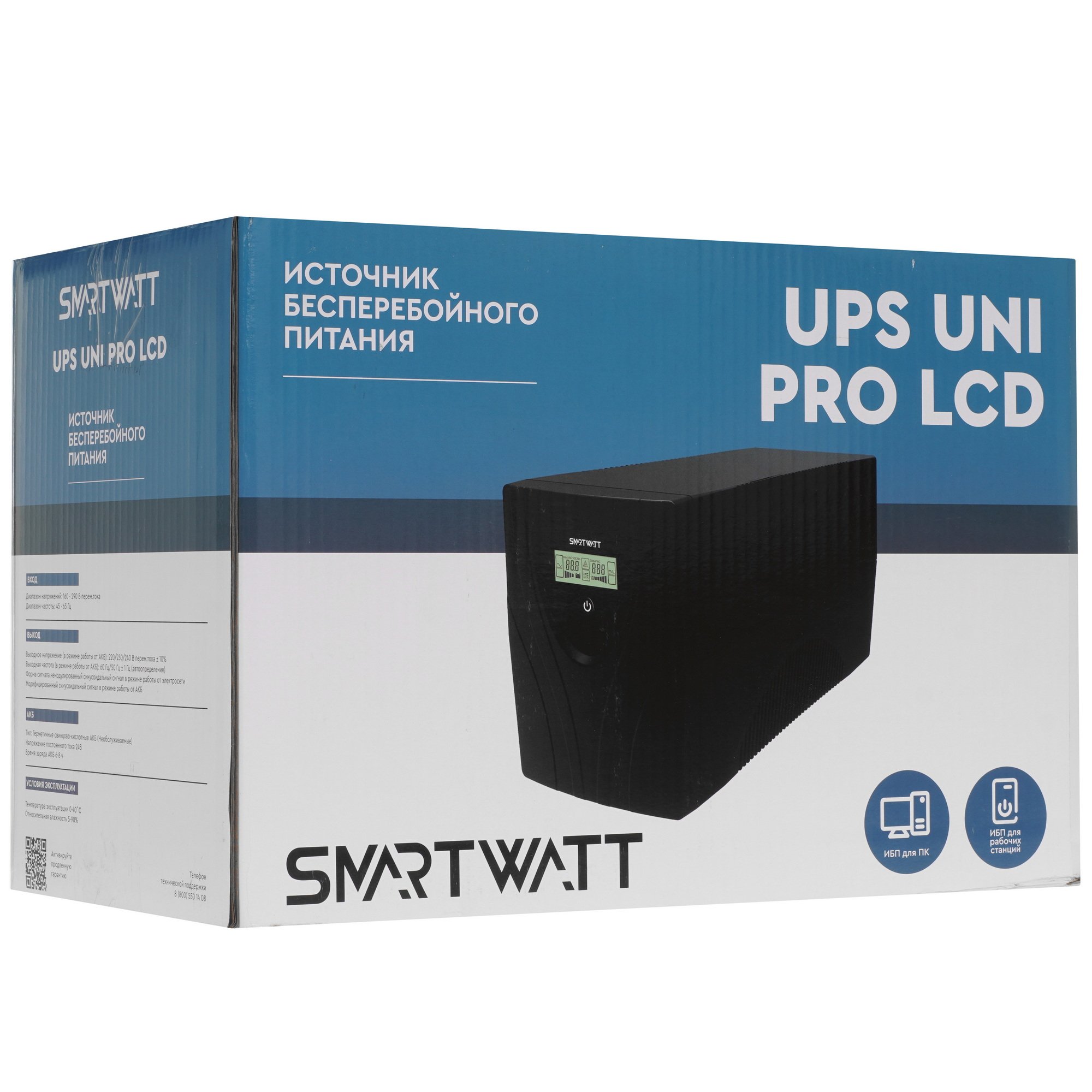 Источник бесперебойного питания SMARTWATT UPS SAFE PRO 1000 черный 1000/600 ВА/Вт, линейно-интерактивный, напольный/настенный, LED индикация, Shuko CEE7/4 - 8 шт. (4 шт. с резервным питанием, 4 шт. - сетевой фильтр)