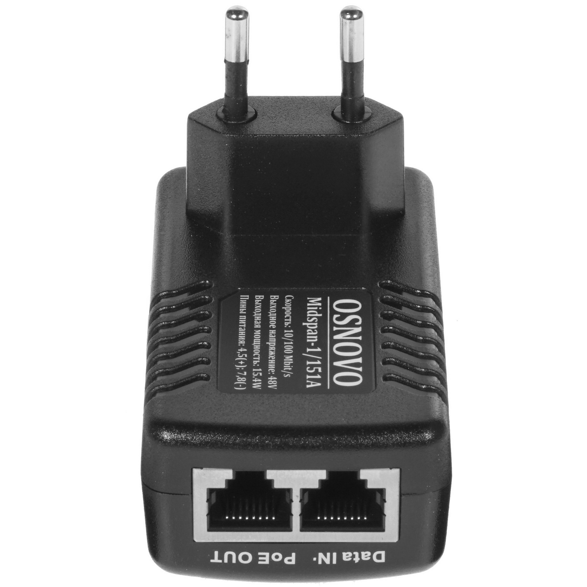 Инжектор PoE OSNOVO Midspan-1/151A представляет собой простое и функциональное решение для питания при помощи технологии PoE различного оконечного оборудования, поддерживающего IEEE 802.3af. Модель отличается удобством использования — на корпусе предусмотрено 1 вход RJ-45 с пропускной способностью до 100 Мбит/с для кабеля, передающего данные, Рядом расположен выход RJ-45 для передачи данных и питания устройства. Мощность PoE на порт может достигать 15.4 Вт, а напряжение — 50 В (конт. 4,5(+), 7,8(-)). Сам адаптер подключается в обычную розетку 220 В.