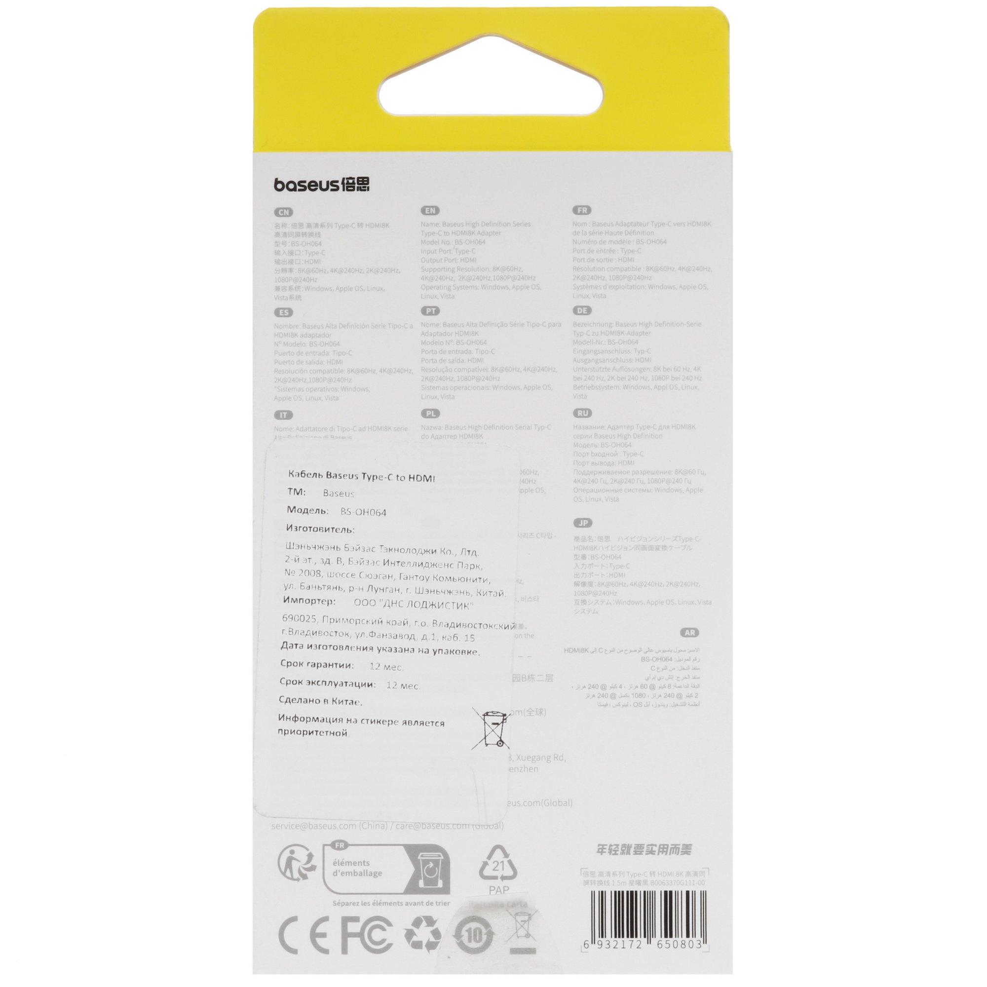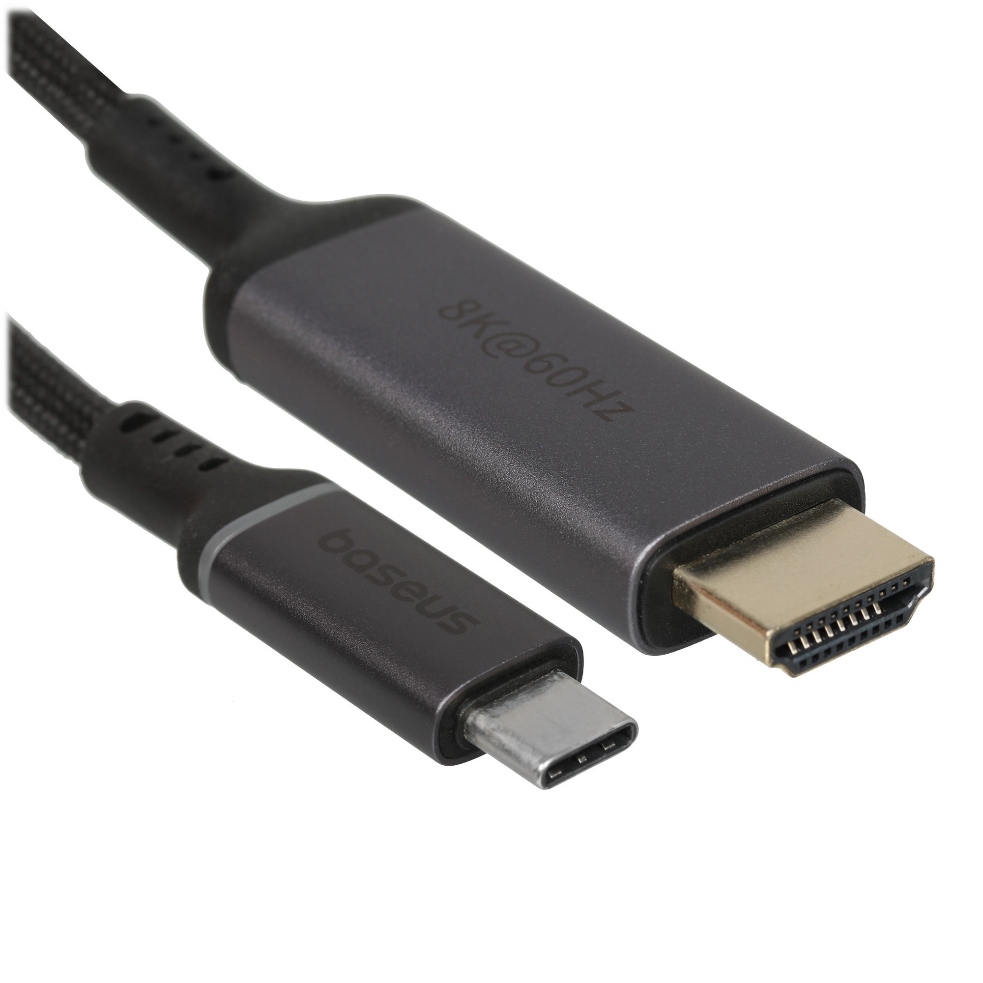 Кабель Baseus USB-C - HDMI, 1.5 м черного цвета поддерживает разрешение до 7680x4320 пикселей при частоте обновления экрана 60 Гц. Он предназначен для подключения устройств с разъемами USB-C - HDMI друг к другу.