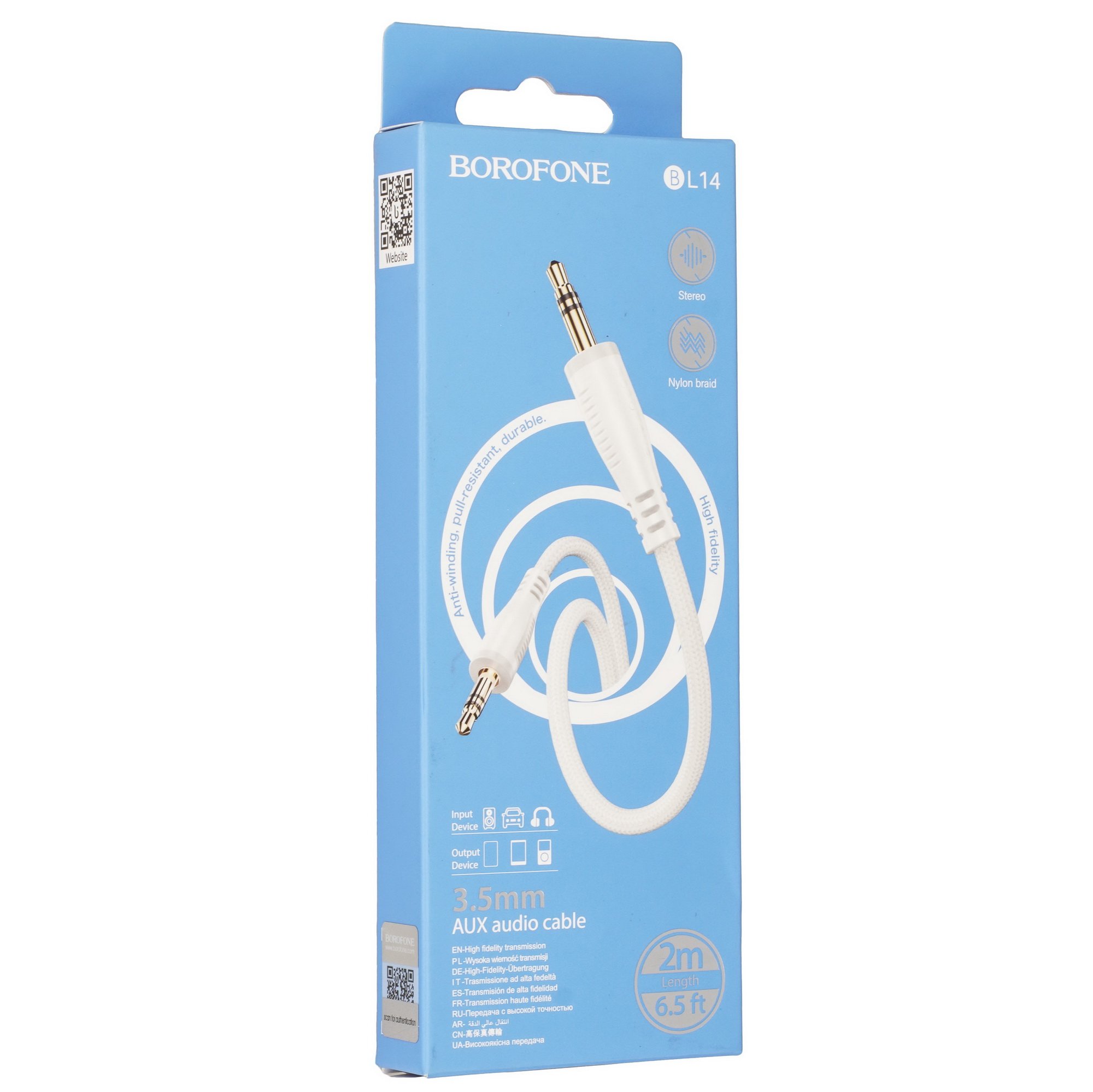 Кабель Borofone jack 3.5 мм - jack 3.5 мм с исполнением в белом цвете обеспечивает передачу аналогового аудиосигнала от источника воспроизведения (смартфона, ноутбука, плеера) к усилителю, автомагнитоле или акустической системе с разъемом AUX. Круглый в сечении соединительный кабель отличается длиной 2 м. Медные проводники кабеля снабжены защитой от замыкания и влаги в виде гибкой полимерной оболочки.