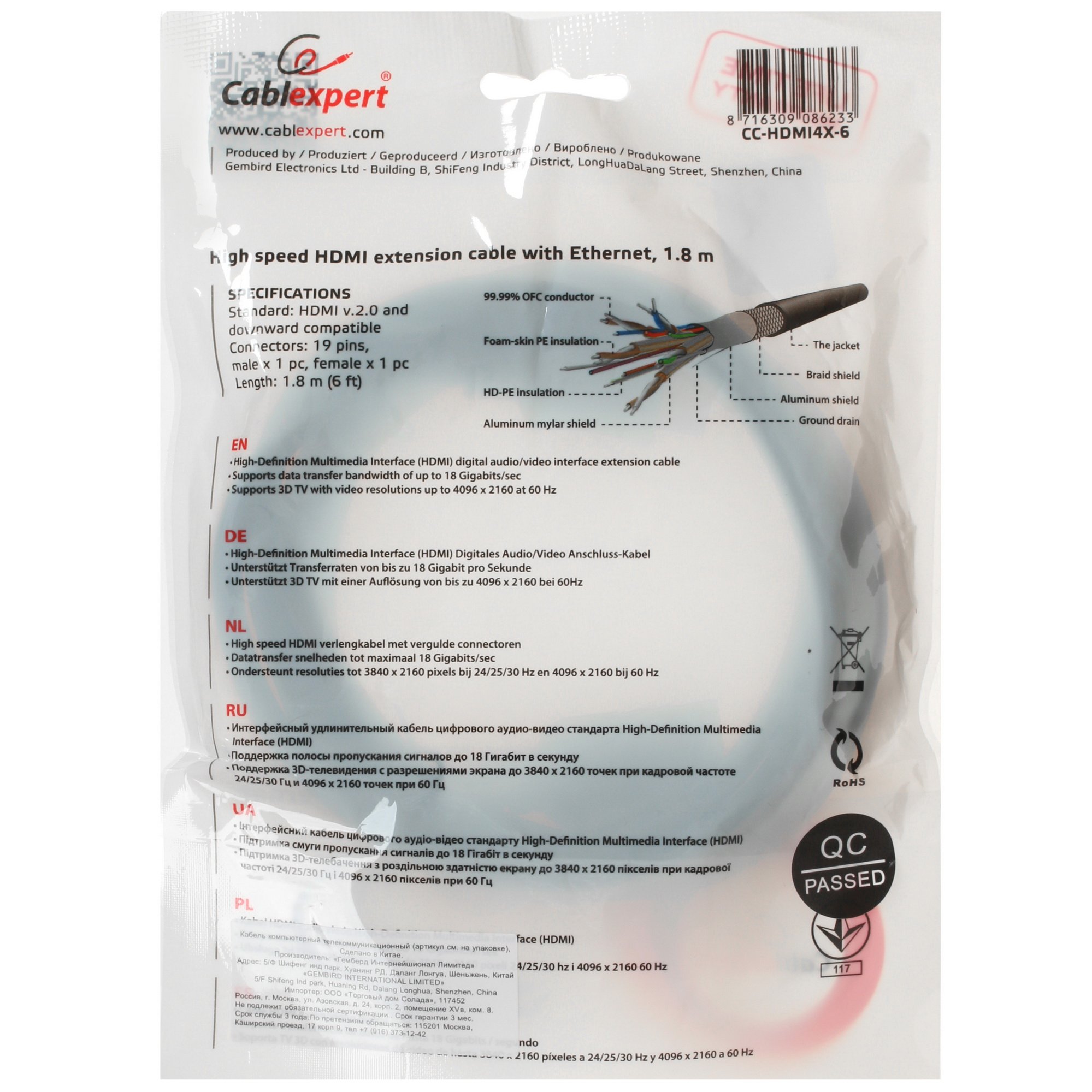 Удлинитель Cablexpert HDMI – HDMI предназначен для организации двустороннего обмена данными между двумя устройствами с поддержкой интерфейса HDMI. Максимально поддерживаемое разрешение составляет 4096x2160 пикселей при частоте 60 кадров в секунду. Пропускная способность до 18 Гбит/с обеспечивает высокое качество передачи аудио и видеосигнала без помех. Длина удлинительного кабеля Cablexpert HDMI – HDMI составляет 1.8 м. Позолоченные контакты на разъемах гарантируют высокий уровень стабильности и надежности в эксплуатации кабеля.