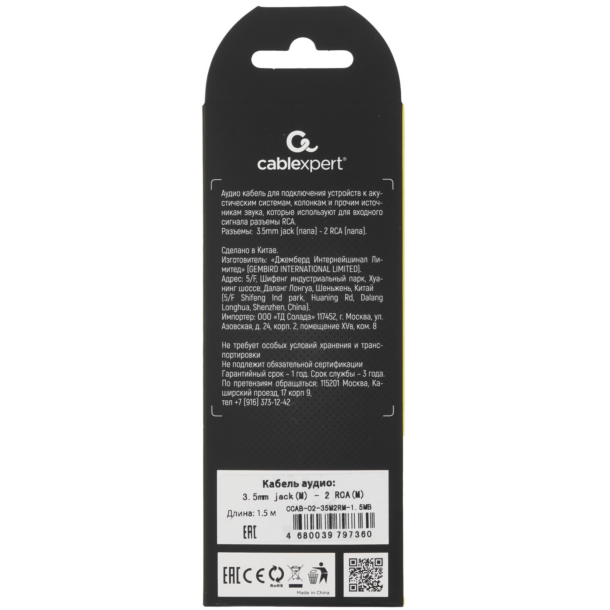 Кабель аудио Cablexpert CCAB-02-35M2RM-1.5MB. 3.5 Jack(M)/2х RCA (M), черный, 1.5м, блистер