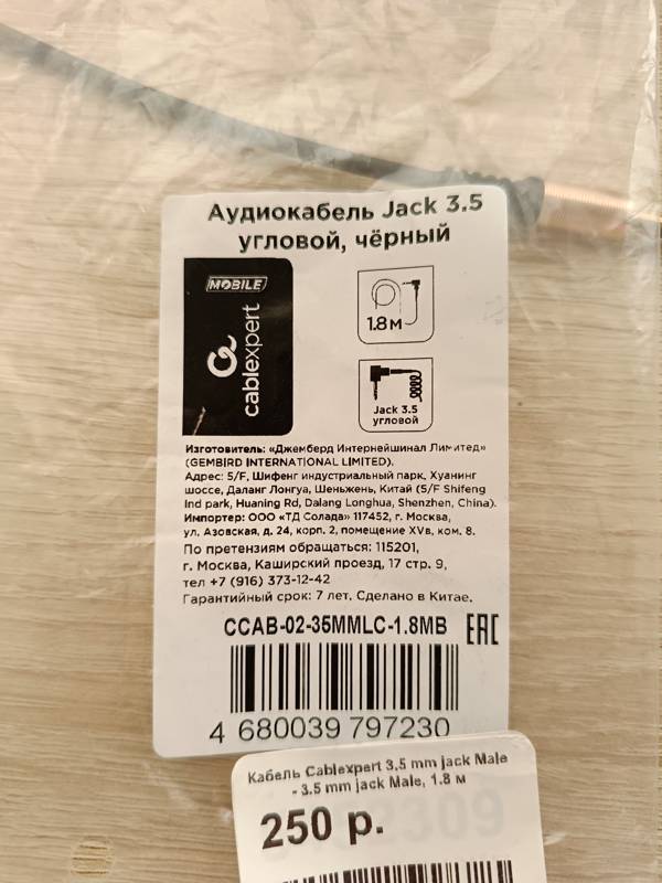 Cablexpert 3.5 mm jack - 3.5 mm jack длиной 1.8 м удобен для подключения устройств на некотором расстоянии друг от друга. Плотная оплетка сохраняет гибкость и устойчивость к износу. Штекеры с позолоченными контактами гарантируют надежность соединения и передачу аудиосигнала без ухудшения качества.