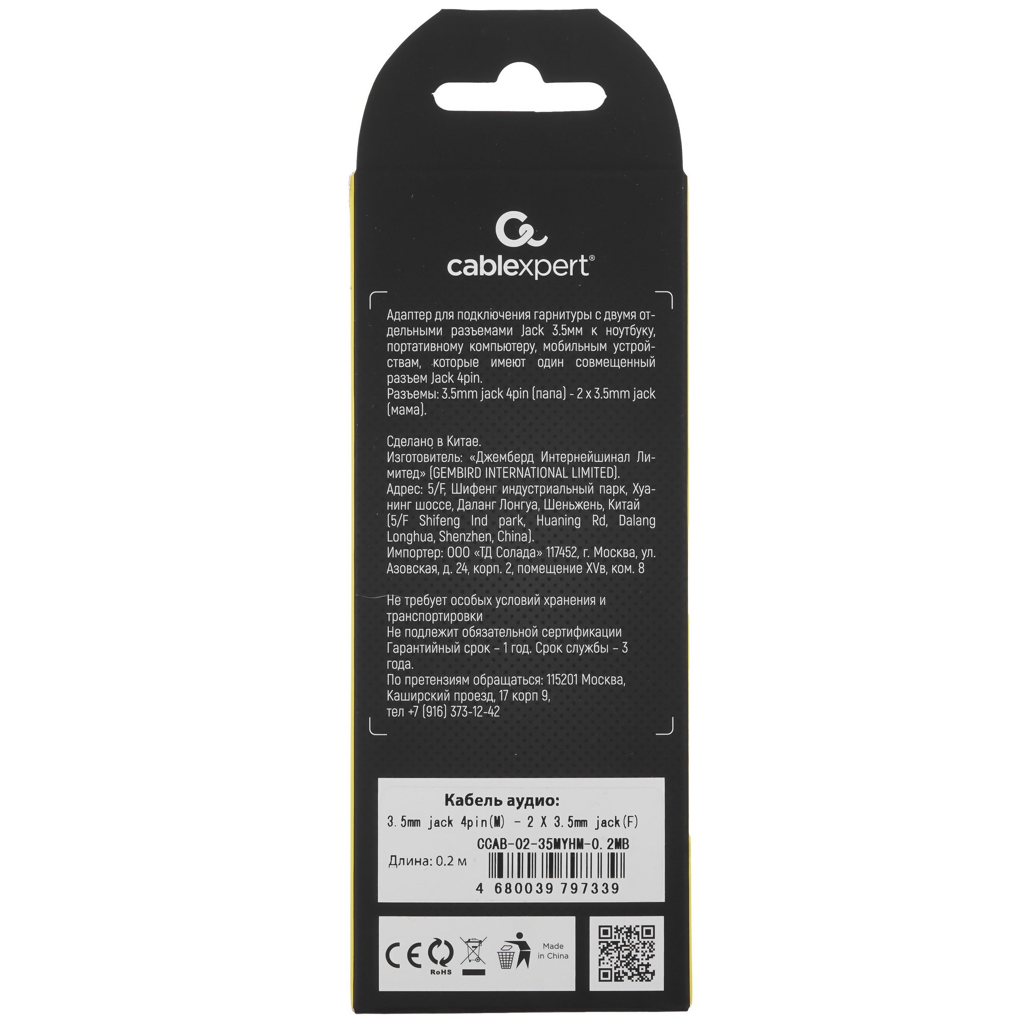 Черный разветвитель Cablexpert 3.5 mm jack x2 - 4-pin 3.5 mm jack соединяет наушники или динамики с аудиоразъемом другого устройства. С его помощью вы можете транслировать звук со смартфона или портативной колонки на магнитолу, саундбар или мощный музыкальный центр. 2 Female-разъема jack 3.5 mm позволяют подключать наушники и микрофон к ноутбуку или другому устройству с 1 аудиопортом.