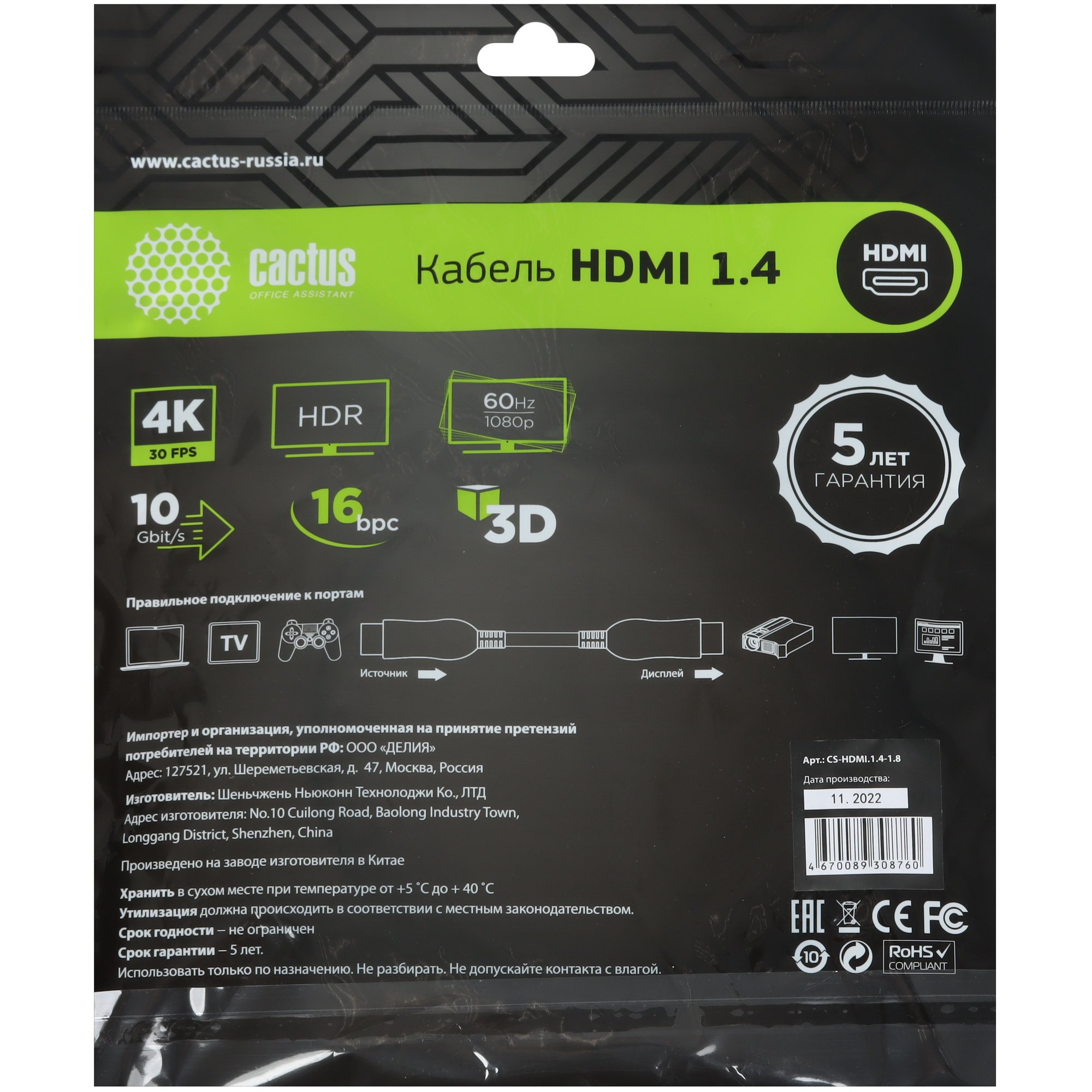Кабель аудио-видео Cactus CS-HDMI.1.4-1.8 HDMI (m)/HDMI (m) 1.8м. Позолоченные контакты черный