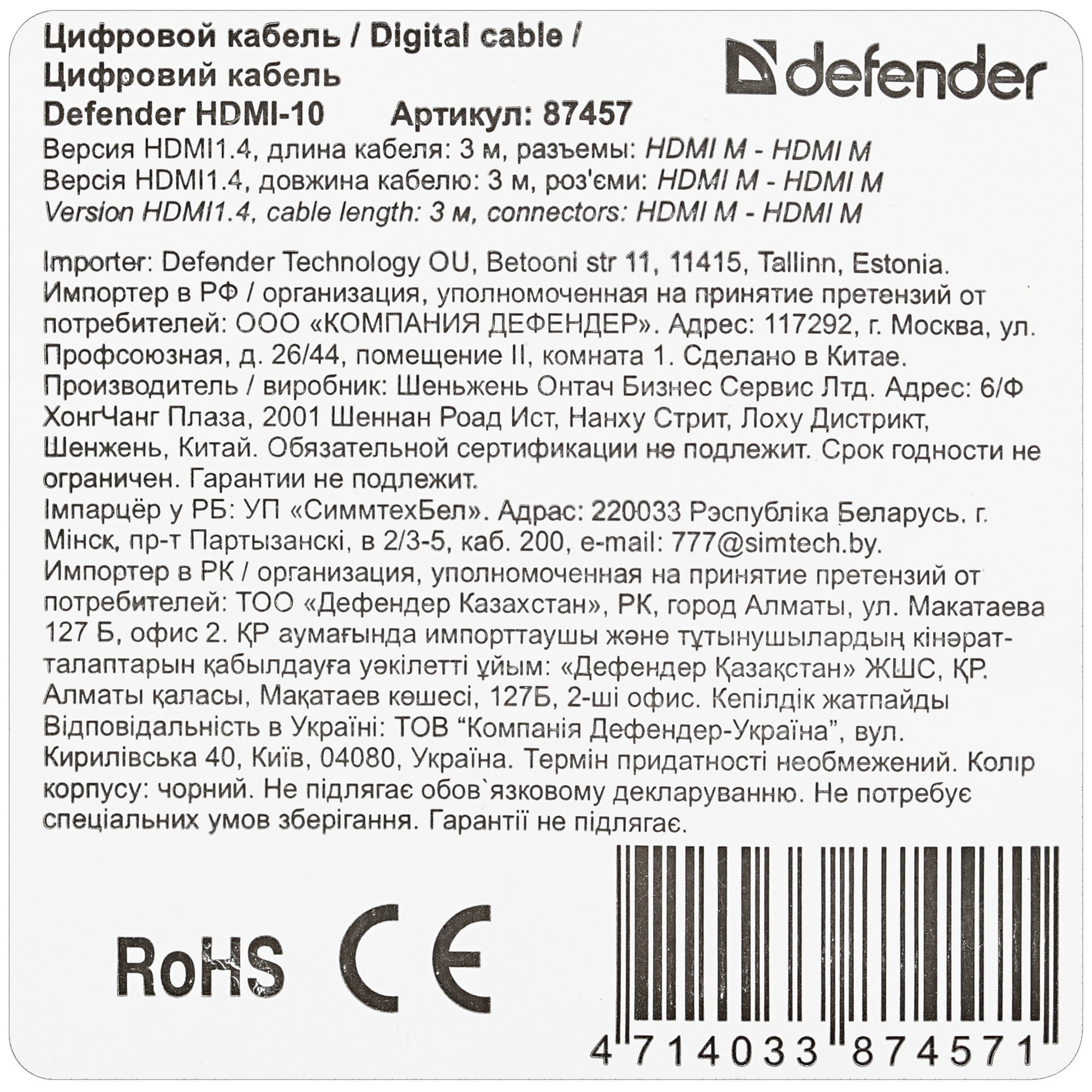 Кабель соединительный Defender HDMI – HDMI принадлежит к версии 1.4 и способен обеспечить высокое качество передачи видео цифрового формата между необходимым оборудованием. Металлические коннекторы гарантируют стабильность сигнала без помех. Проводник из бескислородной меди помогает добиться бесперебойной передачи сигнала видео и аудио. Оплетка из гибкого прочного материала защищает внутренние провода от различных неблагоприятных воздействий. Одним из преимуществ кабеля Defender является увеличенная длина 3 метра.