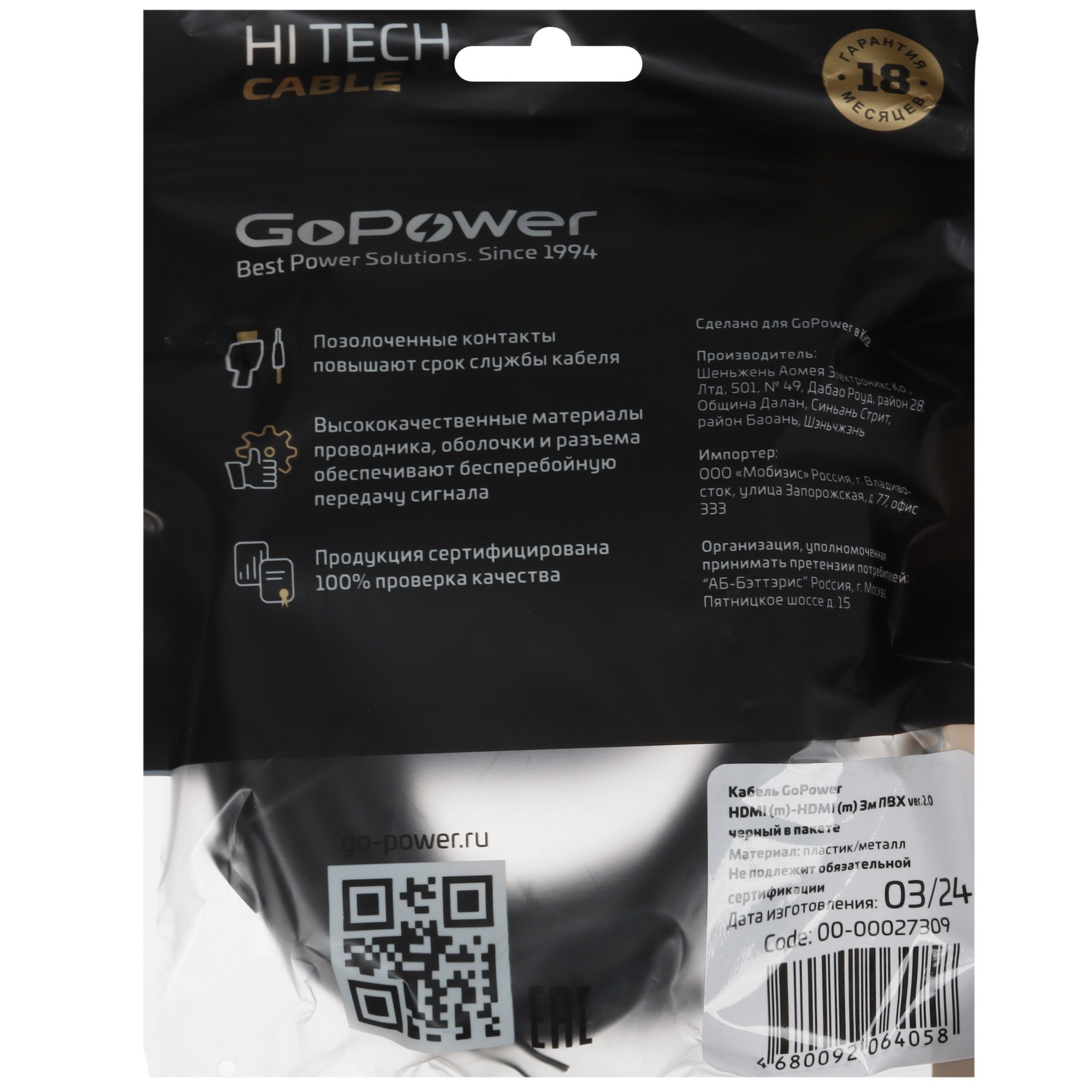 Кабель GoPower HDMI (M)-HDMI (M) 3.0M 00-00027309 черный